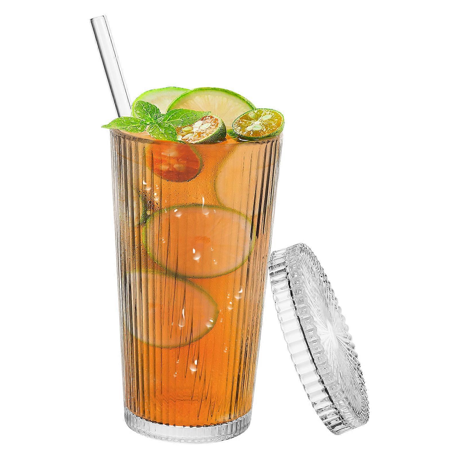 Reusable 2Pcs Striped Glass Drinking Cup With Lid And Straw For Home Use Featuring Stylish Design And Construction