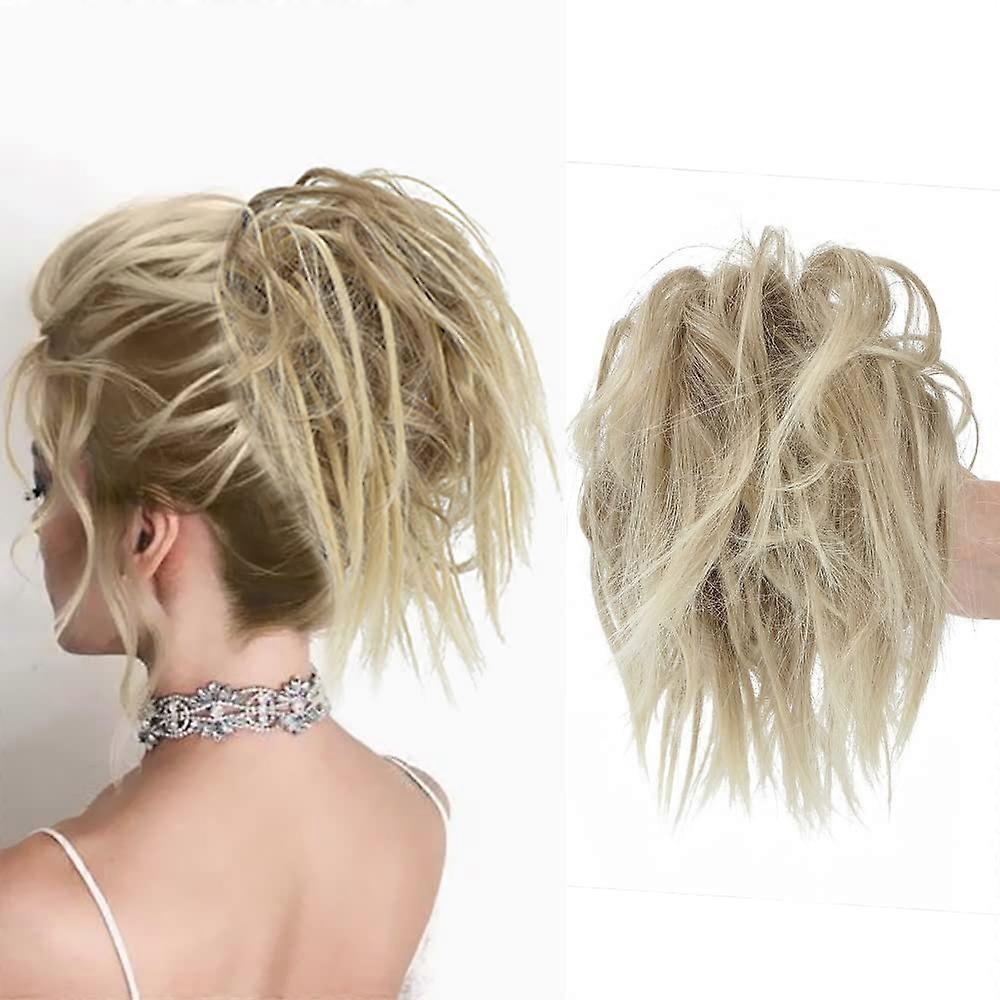 Messy Bun Hair Piece,Synthetic Tousled updo Short Ponytail Faux Hair Scrunchie with Elastic Rubber Band Fake Hair Bun for Women (Pale Golden Blonde M