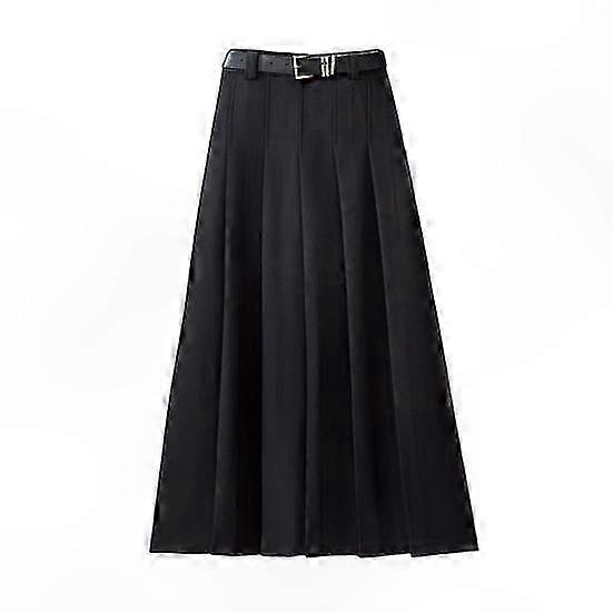 Solid Color A-Line Long Skirt with Belt High Waist Pleated Ankle Length Office Wear