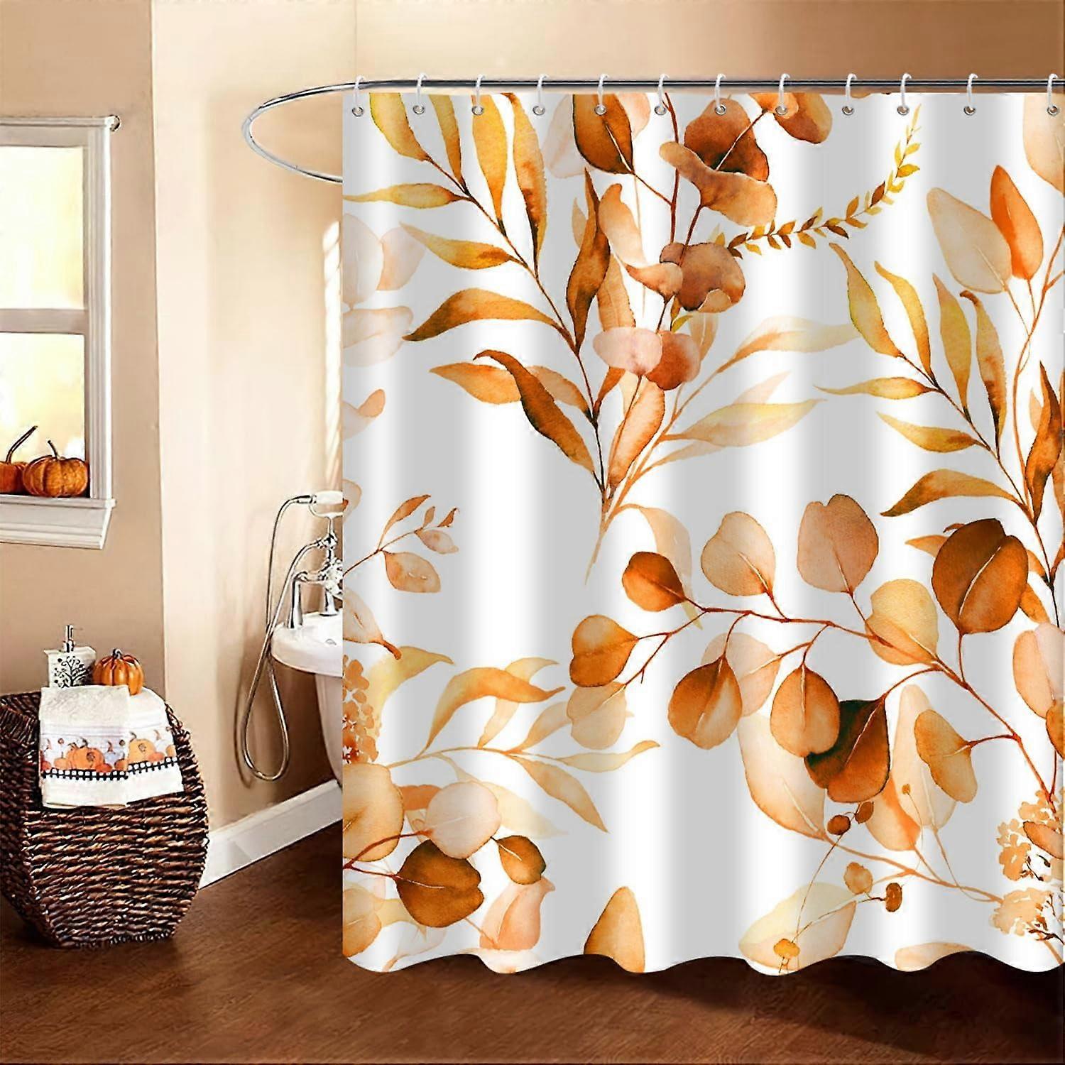 Orange Eucalyptus Leaf Shower Curtain, Botanical Watercolor Plants Bathroom Decor, Waterproof Fabric with 6 Hooks, 36"x72"