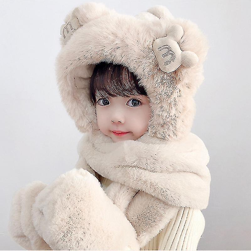Kids Teens Girls 3 In 1 Warm Set Plush Fluffy Cartoon Winter Hat Scarf Mitten Gloves