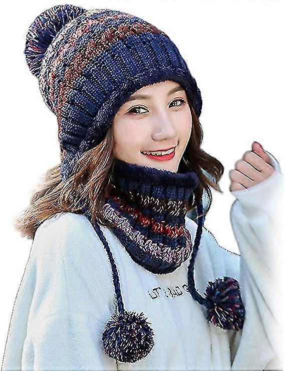 Women Winter Beanie Hat Peruvian Circle Scarf Set Ski Ear Flaps Caps Dual Layered Fleece Lined