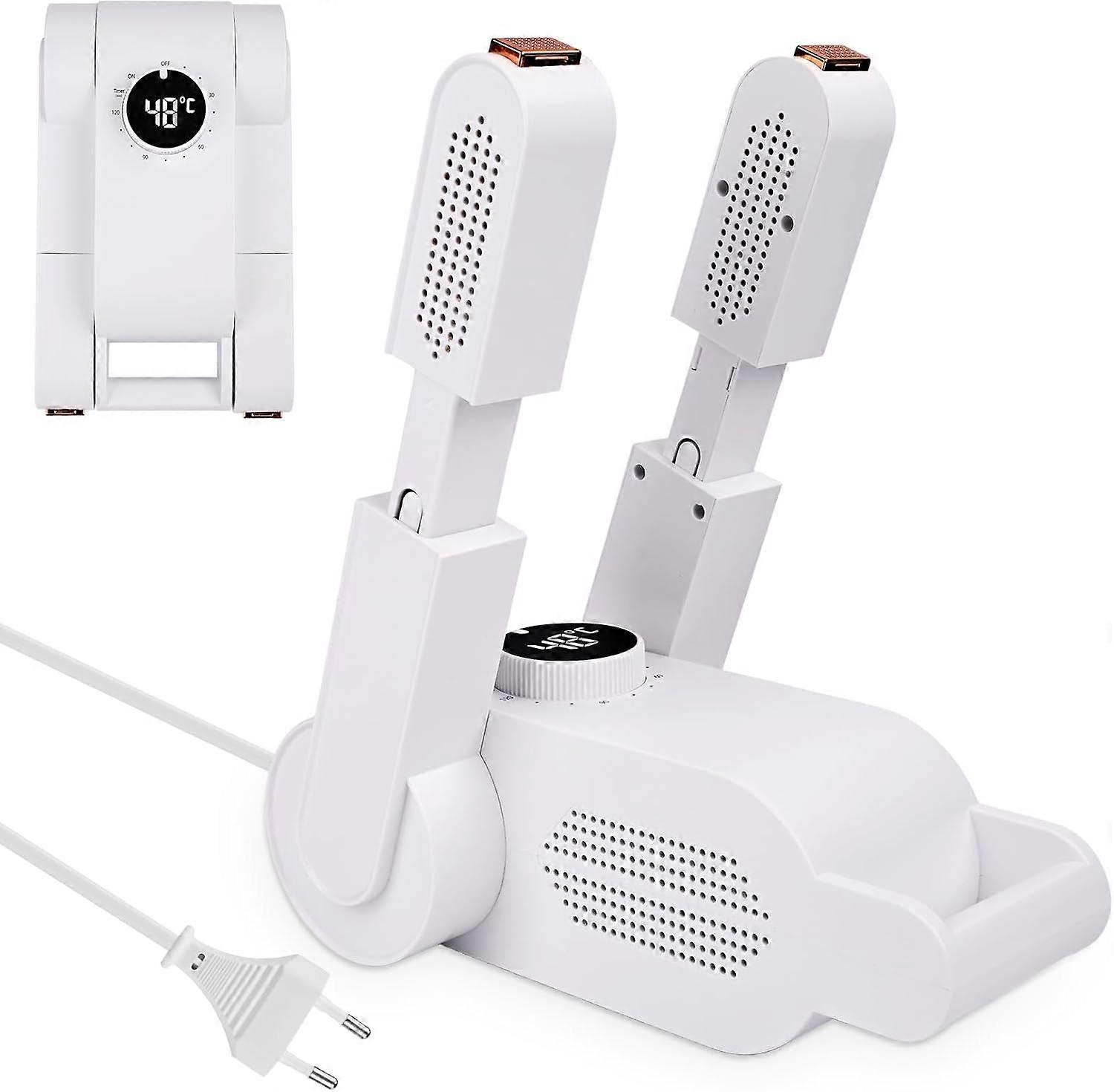 Dimensions: 25 cm x 16 cm x 8 cm 【Fast Drying at Constant Temperature】 A simple press is all it takes: this electric shoe dryer reaches a constant temperature of 46°C in just 15 seconds. The densely aligned air vents create a hot air circuit circulating inside the shoe, evenly distributing heat 360°. Even hard-to-reach areas are dried effectively without damaging the materials. 【Double Sterilization】 UV technology combined with an activated carbon filter effectively eliminates bacteria and odors. The built-in PTC heating element controls heat emission to destroy the environment conducive to the proliferation of microorganisms. This electric shoe dryer keeps your shoes hygienically clean after each use. 【Smart Timer】 Suitable for different shoe materials, thicknesses, and moisture levels, this shoe dryer allows you to freely adjust the drying time up to 120 minutes. Safe and quiet operation. The precise timer prevents your favorite shoes from overheating and prolongs wearing comfort even after drying. 【Foldable and Extendable】 This ski boot dryer is foldable and adapts to all types of shoes - from boots to sneakers to children's shoes. Also ideal for drying gloves, socks, and other accessories. Compact size easily fits in your suitcase or carry-on luggage. Perfect for travel or home use. 【Fireproof Safety】 This ski boot dryer is made of fire-resistant materials. Resistant to pressure and high temperatures, it won't burn or deform during use. You can dry your shoes with complete peace of mind using this electric shoe dryer without fear of damaging them.
