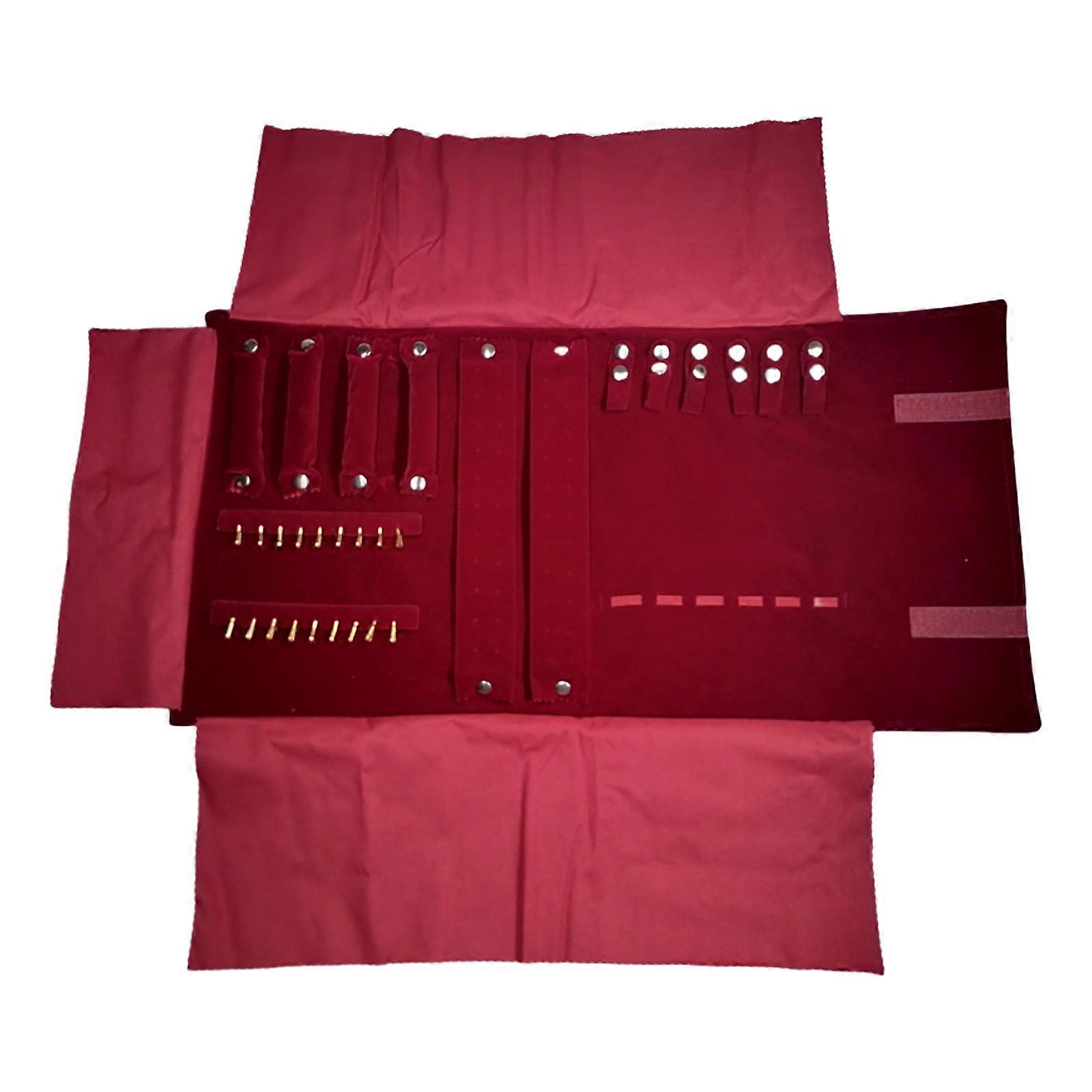 Elegant Farbic Jewelry Roll Bag with Multiple Compartments for Travel Holds Necklaces Rings Earrings Bracelets maroon red