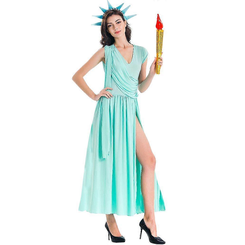Step into history and symbolise freedom in this women's Statue of Liberty costume. Featuring a flowing mint green maxi dress and iconic crown, this elegant outfit captures the spirit of liberty with a soft, modern twist. Material: Lightweight polyester blendStyle: V-neckline, one-shoulder drape, high side slitAccessories: Liberty crown headpiece includedDesign Highlights: Classic mint color, draped silhouette, comfortable fit Available Colour: Mint GreenAvailable Sizes: S, M, L, XL Best For: National holiday events, patriotic parades, themed parties, educational performances, or symbolic cosplay as Lady Liberty.