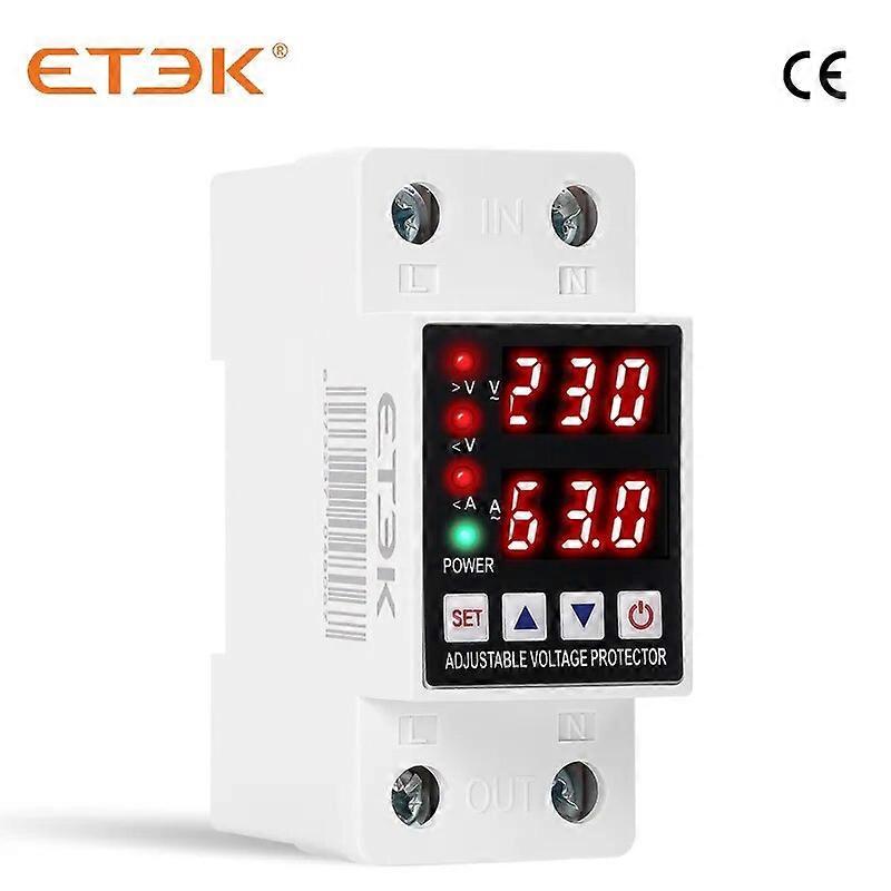 ETEK Din Rail Dual Display Adjustabld Over Under Voltage and Over Current Protector Relay Device 40A 63A 220V 230V EKVAP