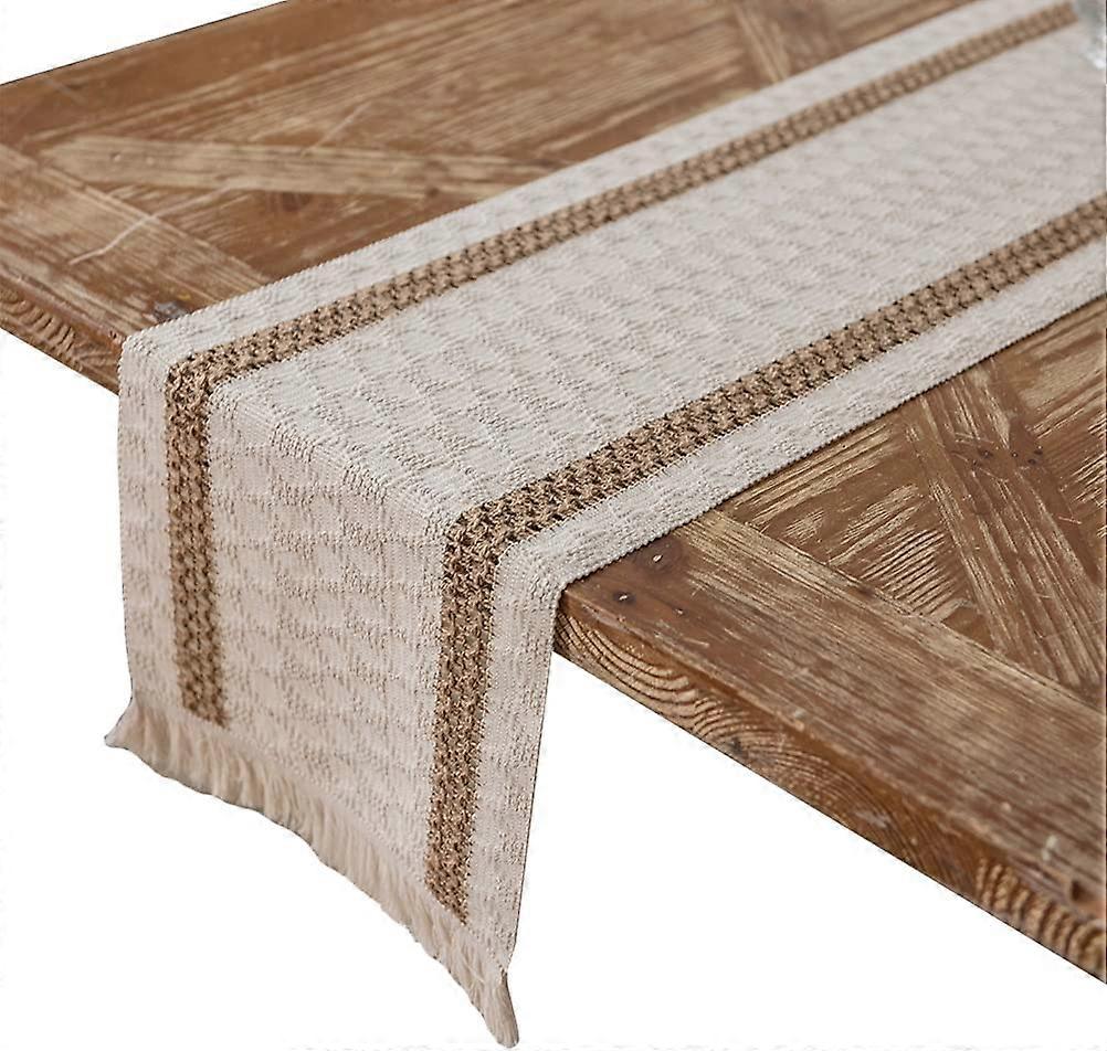 Farmhouse Table Runner Hand Woven Cotton and Burlap Splicing Table Runner with Tassels