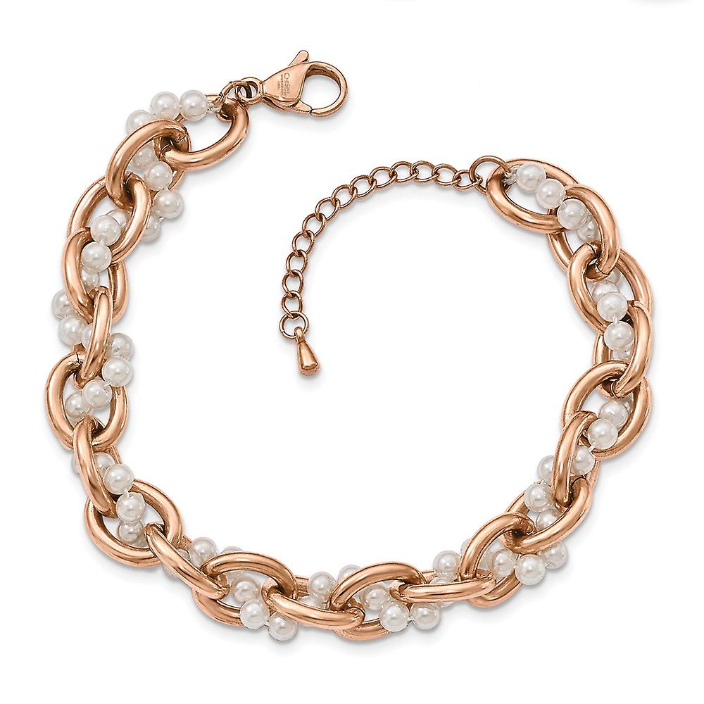 Stainless Steel Polished Rose Ip-plated and Simulated Faux Pearl With 1.5inch Ext. Bracelet - 8 Inch - In Solid Stainless Steel - Product Attributes: - 1.5in extension - Fancy Lobster Closure - Faux pearls - - Length of Item: 8 in - Chain Length: 8 in - Clasp /Connector: Lobster (Fancy) - Finish: Polished - Extender Length: 1.5 in -