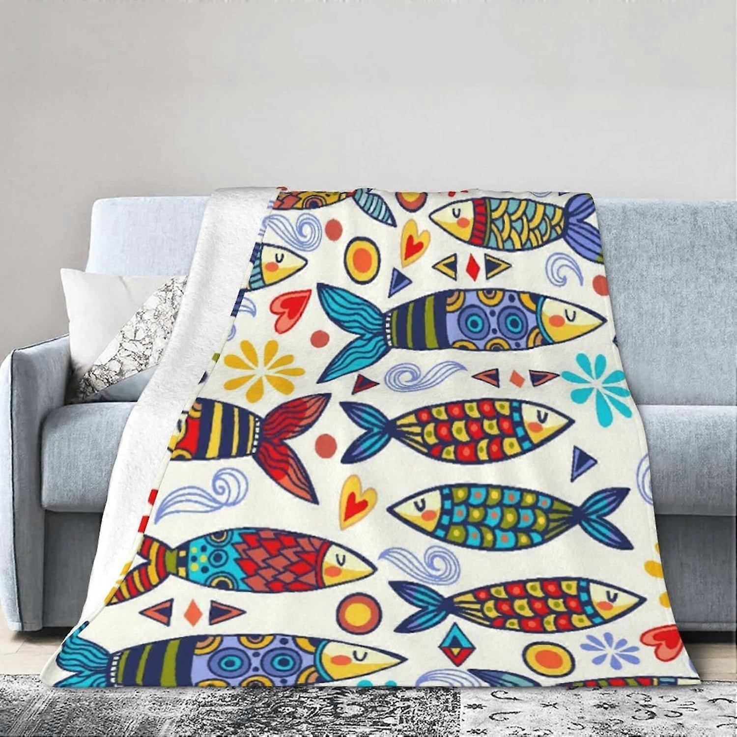Fleece Blanket Bright and Amazing Portugal Pattern of Ornamental Sardines and Graphic Elements Throw Blanket for Couch S-asdfg439