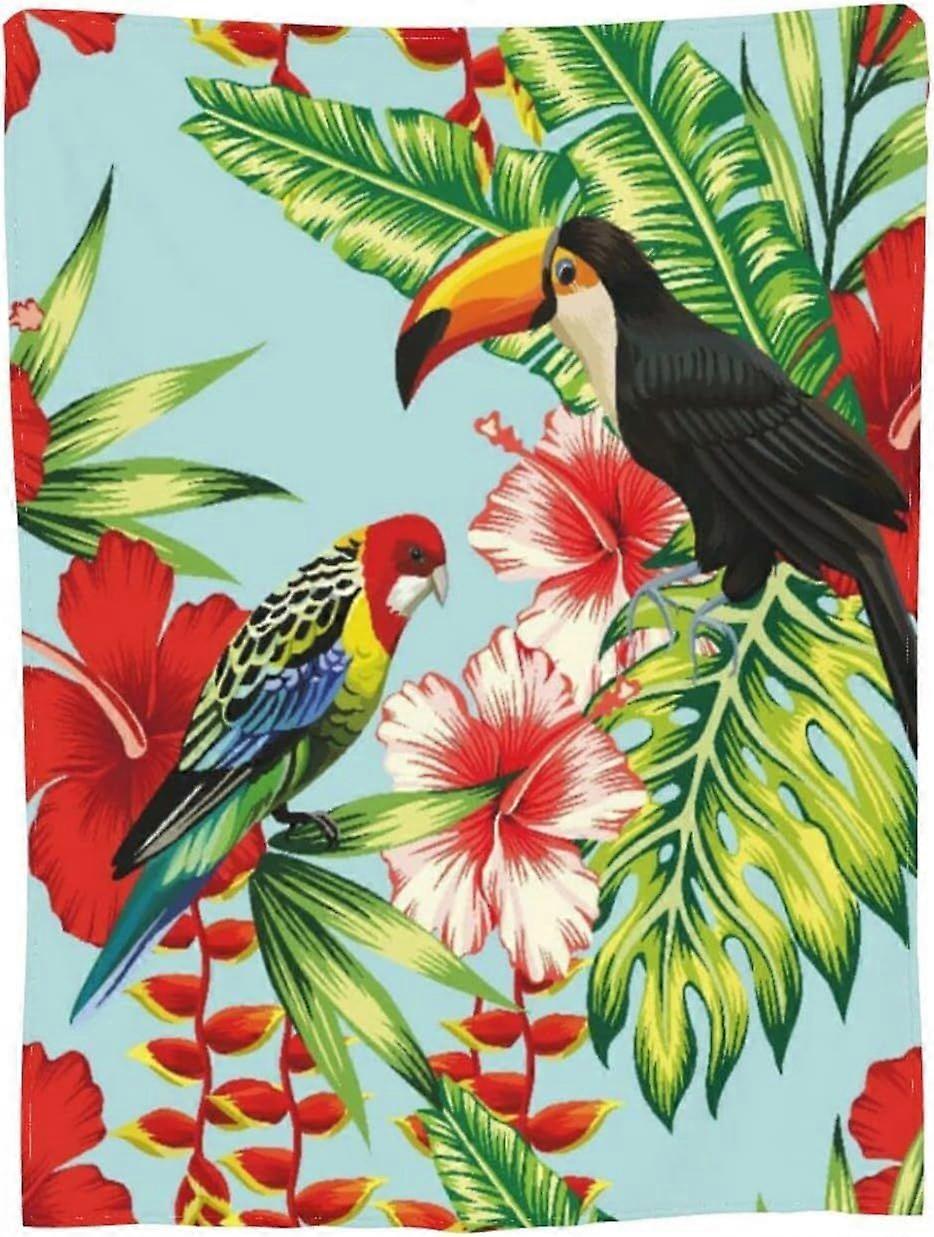 Fleece Blanket Tropic Bird Toucan and Multicolor Parrot On The Background Exotic Flower Hibiscus and Palm Leaf Throw Bla-alksj418