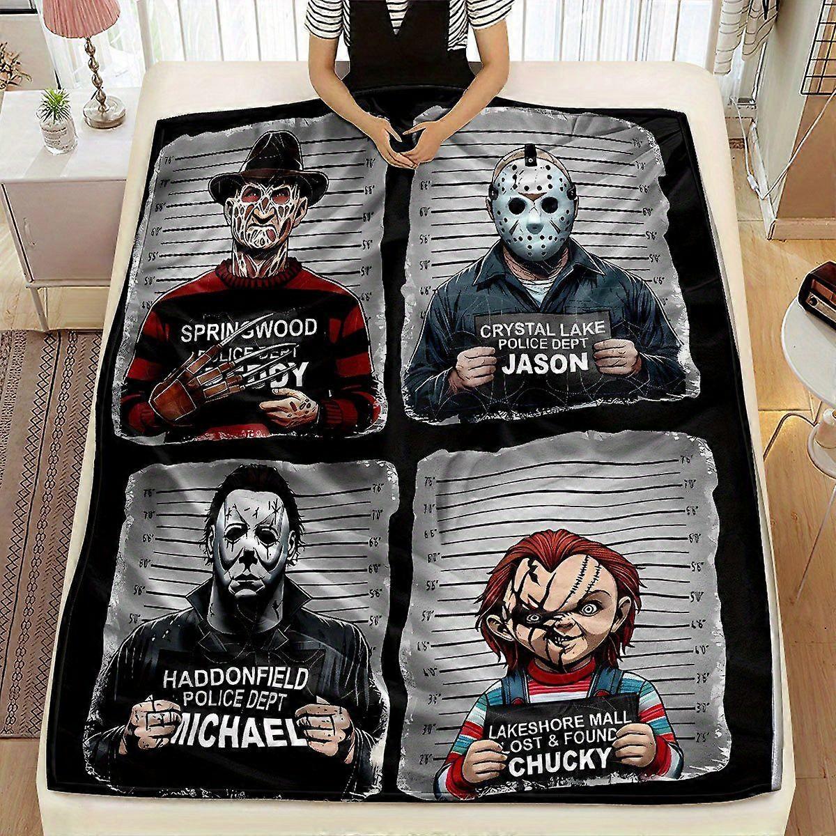 Four Villains Movie Characters Throw Blanket - Freddy Krueger, Jason, Crystal Lake & Chucky Design - Soft Polyester Flan-poiuy112
