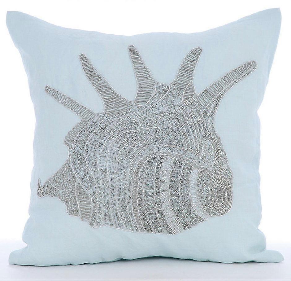 Pillow Case Zipper, Light Blue 24x24 inch Beaded Sea Creatures Ocean Theme Sham, Square Cotton Linen - Lone Shell