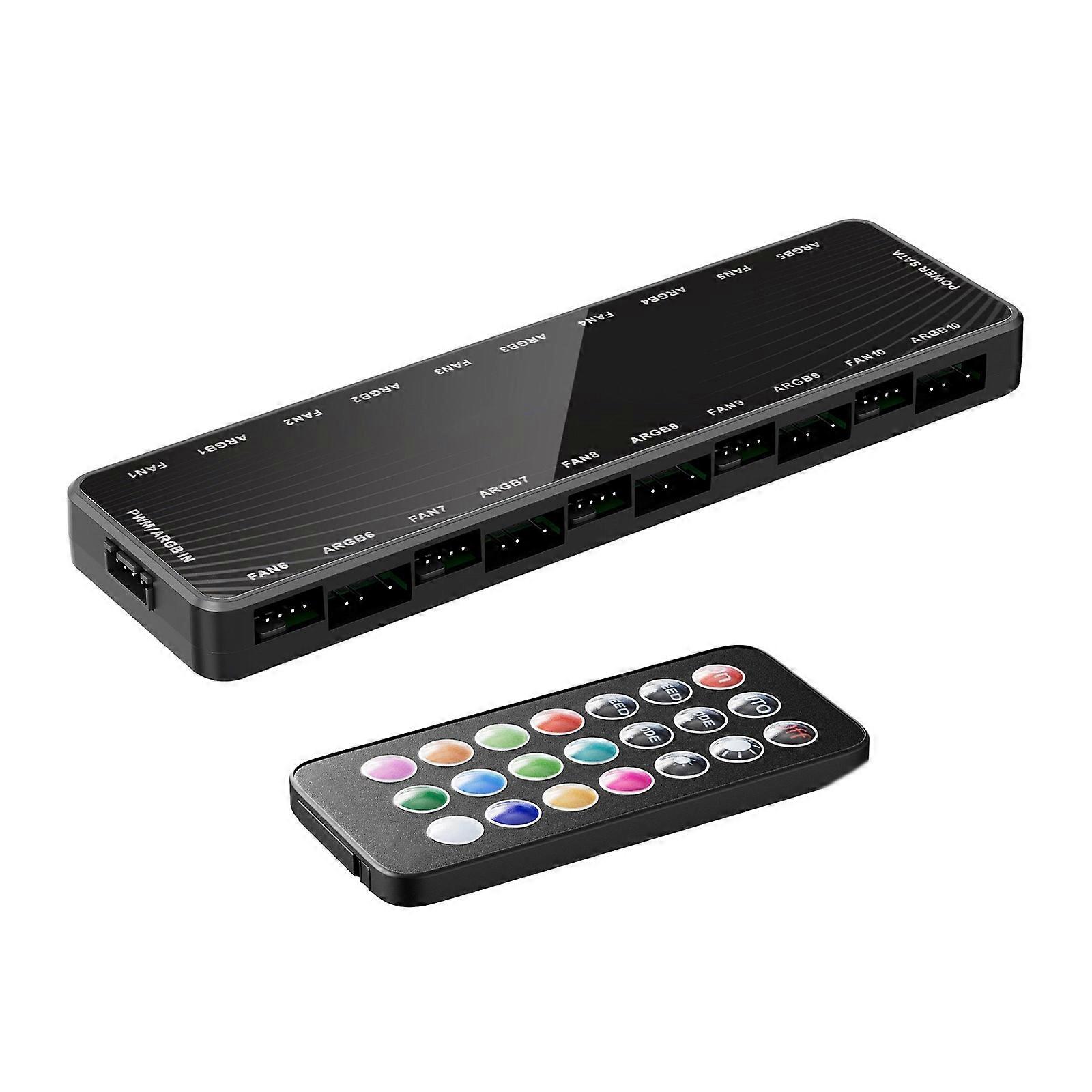 Gaming PC Fan Management Hub, 10 ARGB & PWM Connections, SATAs Direct Power, Remote Included Black
