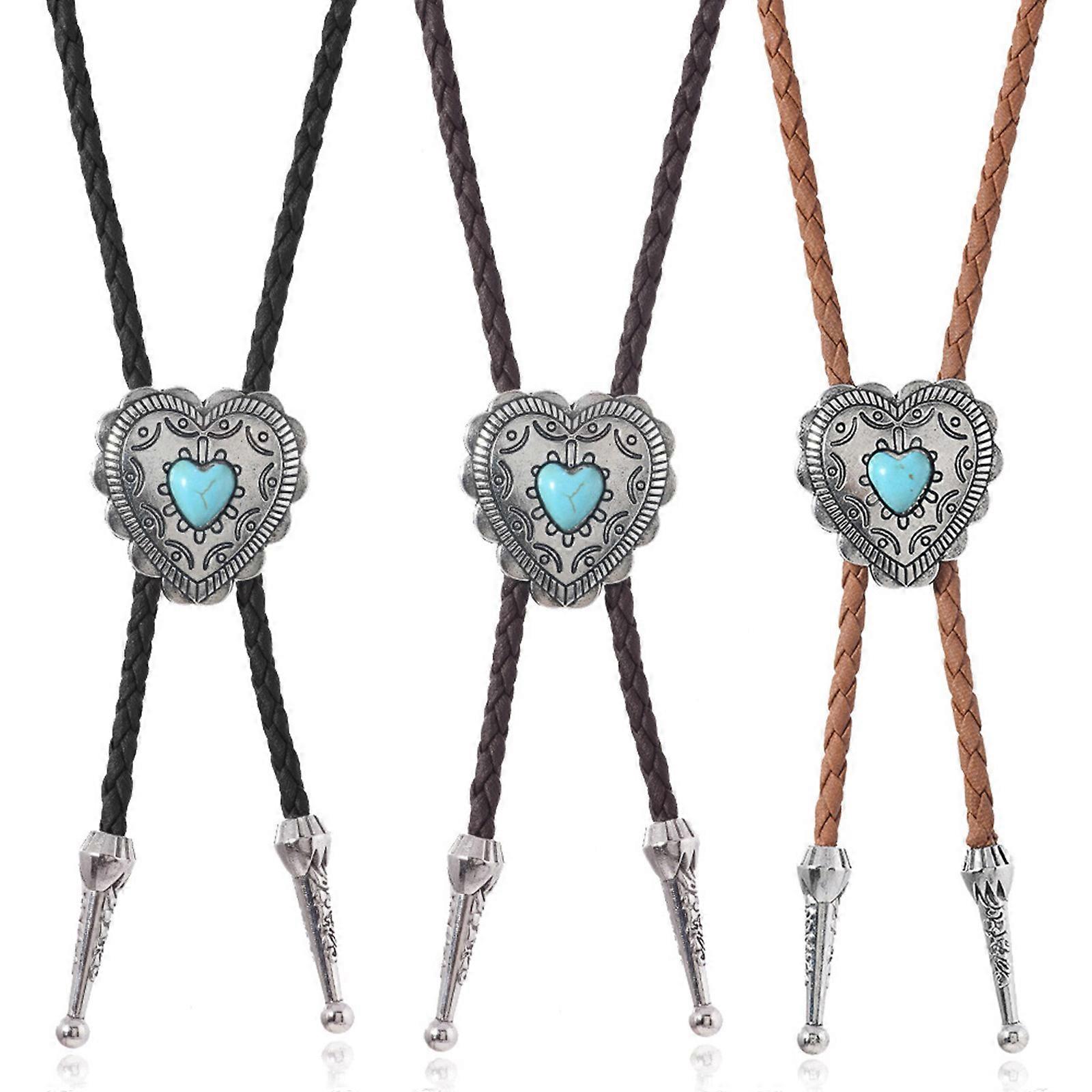 Cowboy Metal Heart Stone Charm Bolo Tie 3 Pack for Western Outfit Accessory with Adjustable Length Leather Cord Necktie