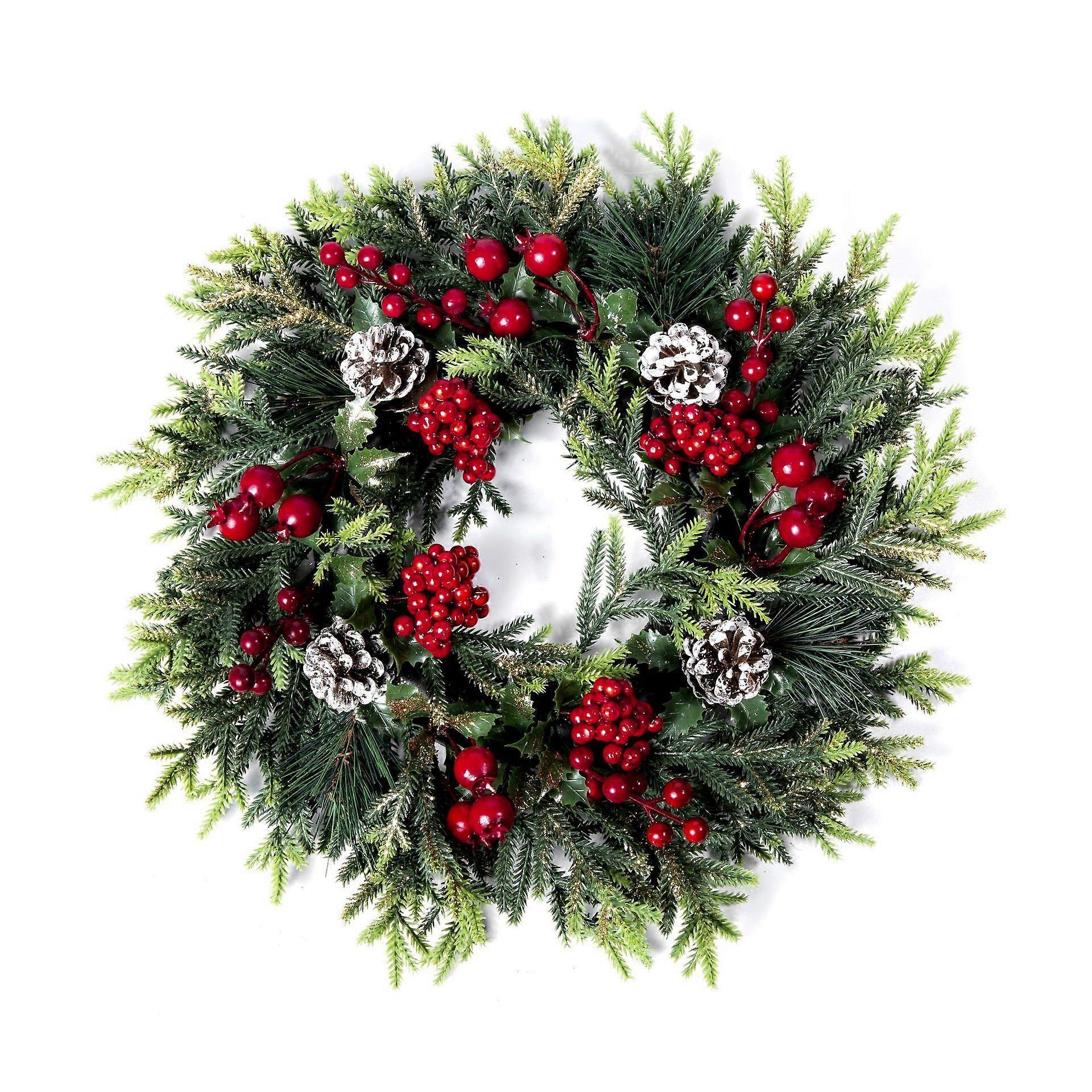 Christmas Wreath - 15 inch artificial Christmas door wreath with red fruits, pine cones Christmas decorations