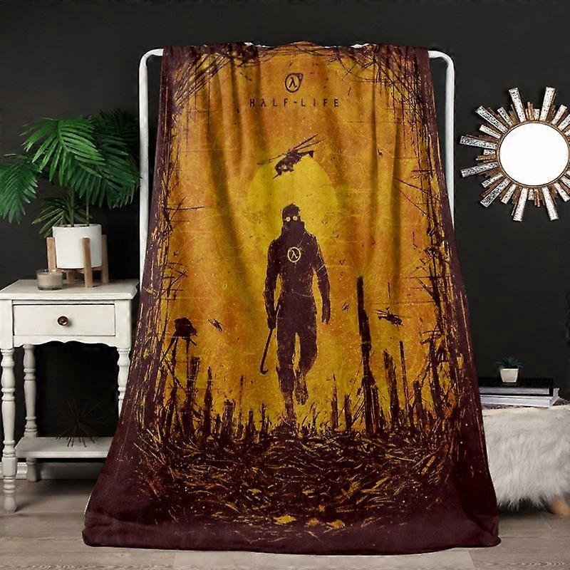 Half-Life Flannel Blanket - Soft & Lightweight Polyester, Digital Print of Gordon Freeman with Sunset Landscape, Ideal f-FDSAP391