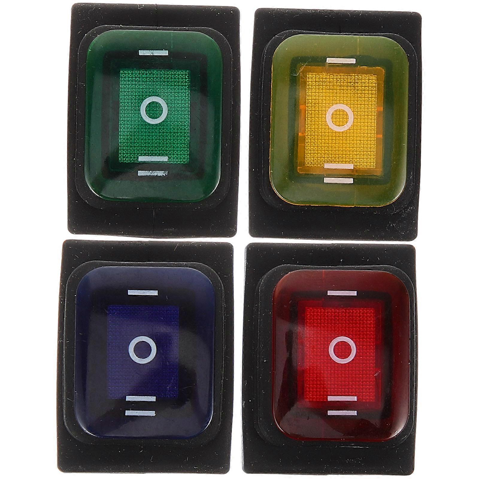 This item is universal for automobiles and devices equipped with a 12 Volt DC power source. Made of , it is easy to setup and durable for usage. It protects against dust and against low pressure water jets. This can replace your old or Features - Light Color: Blue, Red, Green, Yellow Lights. - Material: Plastic and metal. - Size: 4.20X3.80X2.80cm/1.65X1.49X1.10in - Position: On- (Latching). - Rating Voltage: 15A 250VAC / 30A 125VAC. - Temperature -25+85&deg;C. - Resistance:<= 20 M&Omega;. - Insulation Resistance:&ge;100M&Omega;. - Lifetime: 10000times. - Number of Ports: 6 Pins. - Outer SILVER terminal to 12V DC power source. - Middle SILVER terminal to accessory/apparatus. - Outer SILVER terminal to ground. - Protected against dust and against low pressure water jets. - Package includes 4 pieces different colors light . Package list: 1 x Blue Light Rocker Toggle 1 x Red Light Rocker Toggle 1 x Green Light Rocker Toggle 1 x Yellow Light Rocker Toggle