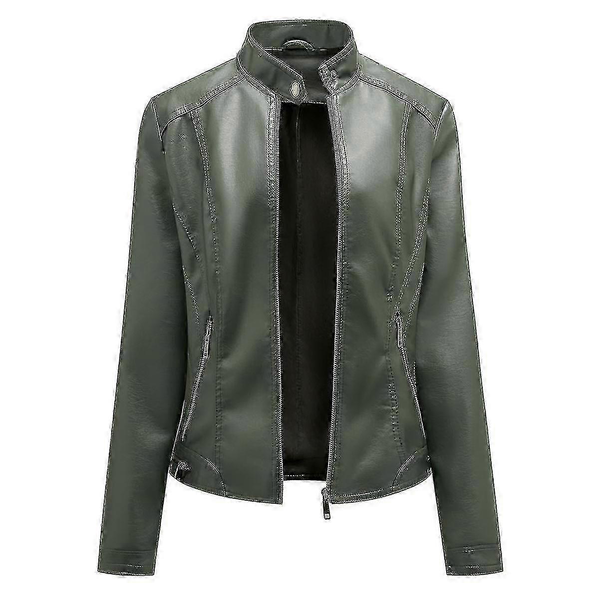 Women's Stand Collar Leather Jacket, Slim Fit Short Length Zip Front Solid Color