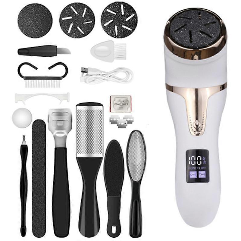 JD-510 Electric Foot File Callus Remover Pedicure Tools Foot Care Kit with 3 Roller Heads,2 Speed,Vacuum Cleaner - White •Removes dead skin calluses and cuticles and collects flakes •Free switch between fast and slow •Charge to light,two-speed switchable dimming •Overcharge and over-discharge protection system •Streamlined appearance,non-slip handle,ergonomic •1200mAh high capacity lithium battery,fast charging,long-lasting life,low noise •Waterproof,the head can be rinsed separately after peeling,or the whole machine can be rinsed clean under the tap (do not immerse in water for a long time) •Specifications: •Voltage: USB charging DC5V,can be used with car charger,computer USB,power bank,etc. •Power: 6W •Charging time: approx. 2.5 hours •Motor speed: about 13500RPM •Machine speed: fast gear is about 2200RPM,slow gear is about 1800RPM •Battery type: Li-ion 1200mAh •Continuous life: approx. 100 minutes,depending on personal usage and cleaning style •Weight: 0.32 kg •Dimensions: 165 x 76 x 50mm Package included: •1 x Foot Callus Remover with Coarse Sand Head •1 x Coarse Head •1 x Fine Sand Head •1 x USB Charging Cable •1 x Cleaning Brush •1Set x Other Accessories •1 x Transparent Protective Cover •1 x English and Chinese Manual