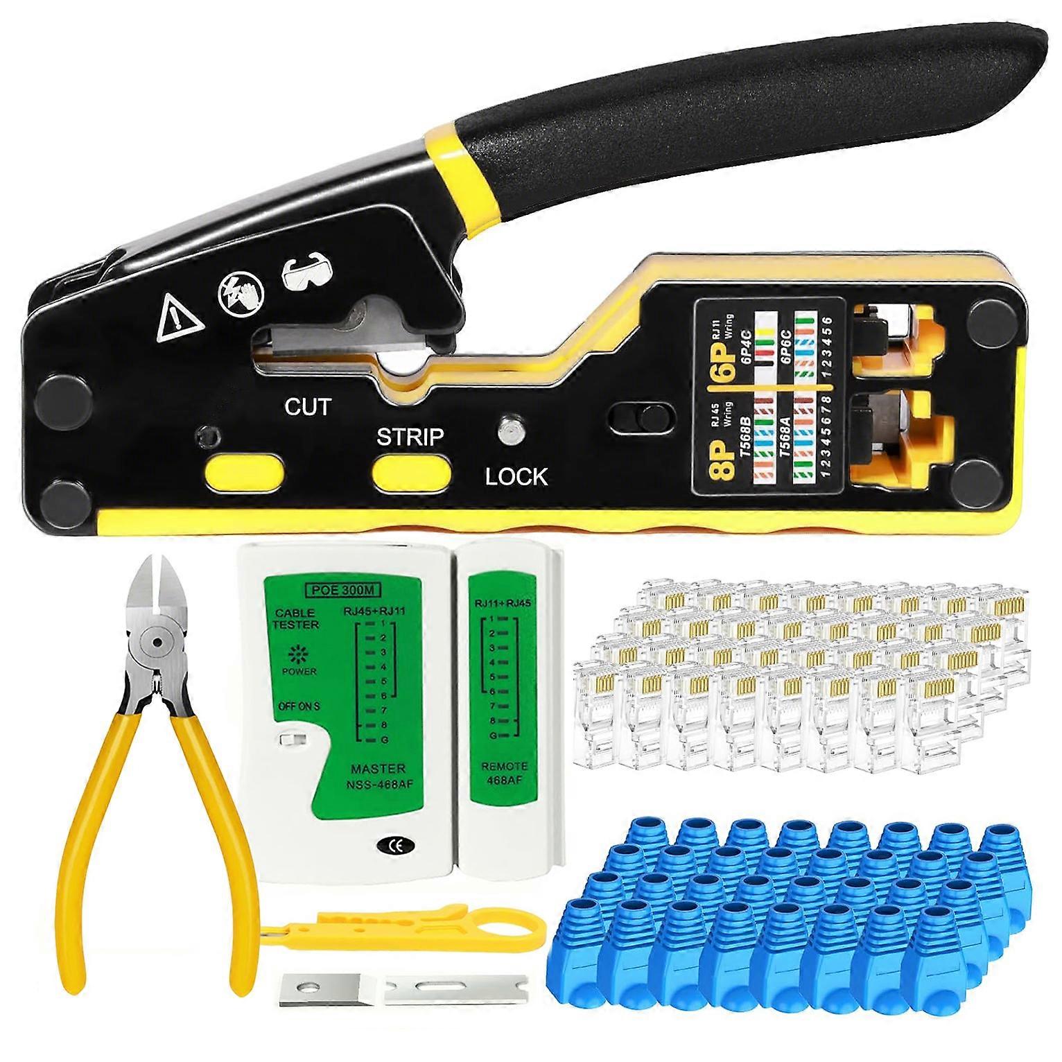 RJ45 Crimp Tool Kit , with 50 pair Cat6 RJ45 Pass Through Connector and Connector Boots,Cat6 Cat6a Cat5 Cat5e Cat7