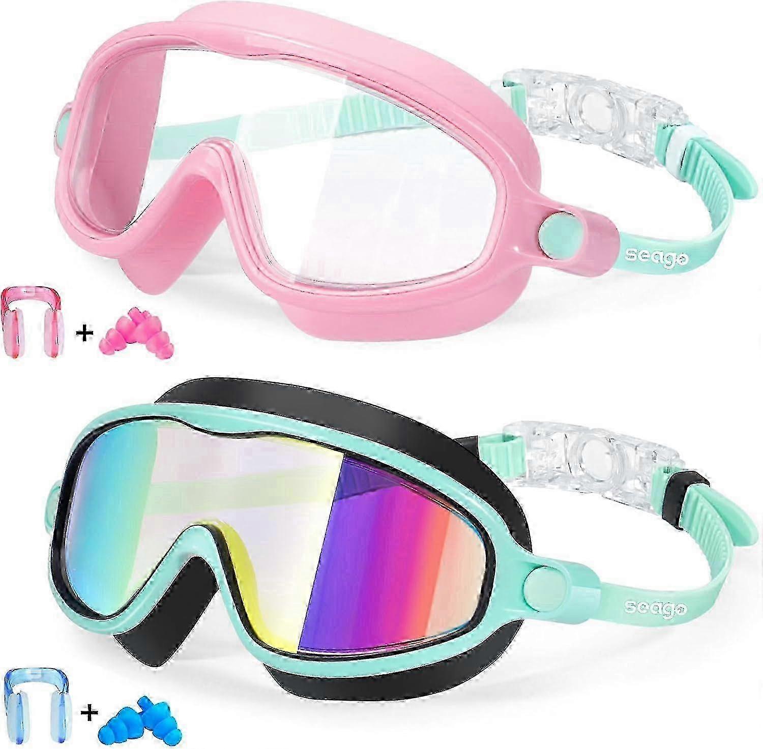 Kids Swim Goggles 2 Pack Uv Wide View Swimming Goggles For 3-14Pink \u0026 Mirrored Blue