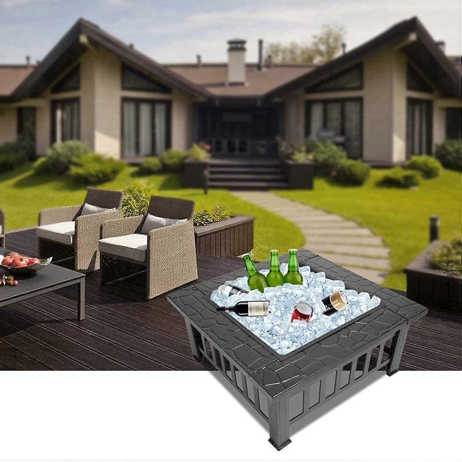 Upgraded 32 Inch Square Fire Pit for outdoor gatherings and backyard use Key benefits Three functions in one unit: use as a fire pit for warmth and ambiance, a BBQ grill for casual cookouts, or an ice pit for chilling drinks. The included grill makes switching to barbecue mode simple. Built for durability: thicker steel frame with a black heat resistant finish improves resistance to temperatures and helps reduce rusting over time. Easy to move and set up: lightweight construction lets you reposition the fire pit around the patio, deck, or campsite as needed. Large usable surface: the 32 inch square provides room around the fire for drinks, plates, and grilling supplies so guests can gather comfortably. Features and performance Size: 32 x 32 x 14.17 inches, delivering a substantial fire area while maintaining a manageable footprint. Material and finish: heavy gauge steel construction with a black heat resistant coating for improved longevity and consistent performance during repeated use. Multipurpose design: includes a grill grate for grilling and can be used as an ice pit when lined with plastic to prevent water leakage. Simple maintenance: steel construction wipes clean and stores compactly when not in use. Practical use scenarios Backyard evenings: create a cozy setting for family and friends to relax, enjoy the warmth, and roast marshmallows. Grilling on the go: use the included grill grate for impromptu barbecues at picnics, tailgates, or on the patio. Party serving station: convert the pit into an ice bucket by lining it with plastic to hold beverages cold during outdoor gatherings. Notes and care If used as an ice pit, line the interior with a waterproof liner to prevent water escape. Keep a safe distance from flammable structures and follow local regulations for open fires. Regular cleaning and drying after use will help maintain the finish and reduce surface rust. Specifications Dimension: 32 x 32 x 14.17 inches Functions: fire pit, BBQ grill, ice pit (use liner for ice) Material: thicker steel frame with black heat resistant finish This 32 inch square fire pit provides a versatile outdoor centerpiece that combines heat, cooking, and serving functions in one durable, portable unit.
