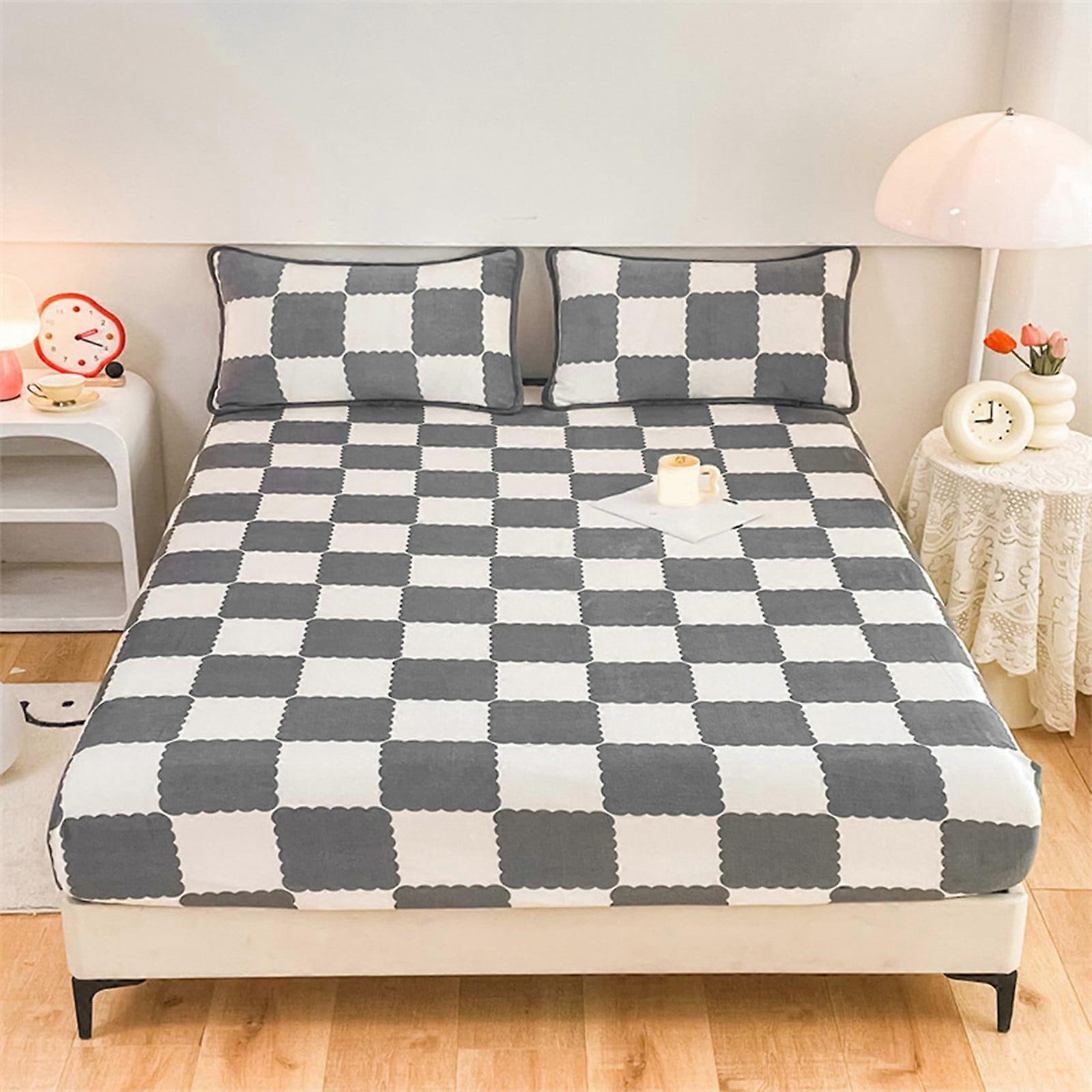 Lksixu Velvet Fitted Sheets Queen, Ultra Soft Flannel Plaid Plush Sheet, Deep Pocket Non-Pilling Warm Bottom Sheet for Winter