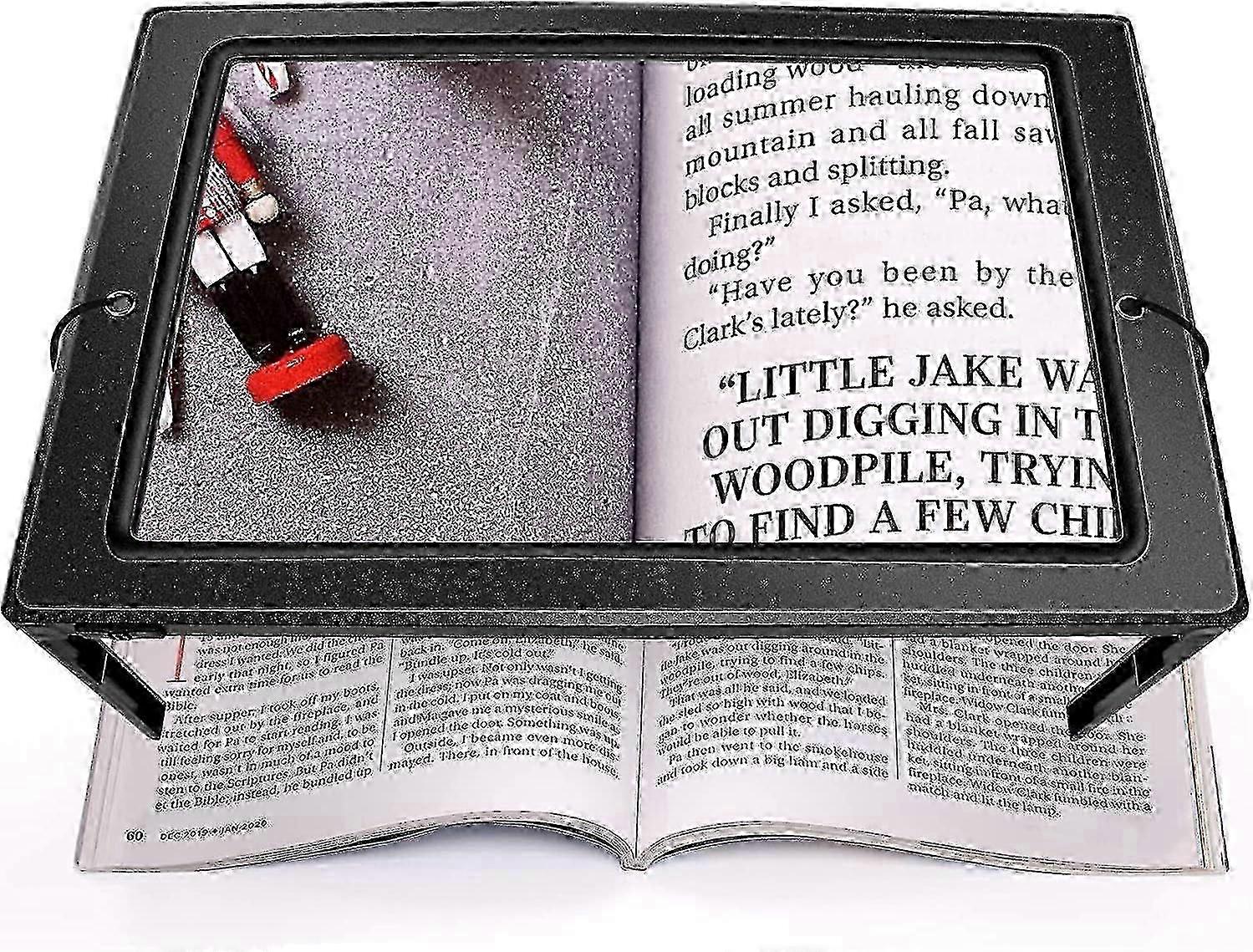 4X Full Page MagnifiersThe lens is made of upgraded acrylic material, not glass, please purchase with caution. The large magnifying glass can magnify up to 4 times, which is the best reading magnification. Page magnifier is perfect for reading books, documents, newspapers, brochures, and small print. 50 LED Lighted MagnifierThe rectangular page magnifying glass is designed with 50 LED lights, the LED lights are of high quality and will not heat up. Suitable for reading in most different lighting environments, and adjusting the appropriate lighting can protect your eyes. Large Viewing AreaThe upgraded acrylic lens can provide a wide reading area, which can display up to 10" content in a large area at one time, and the display area is evenly enlarged, and there is no need to move the desktop magnifying glass many times, allowing you to focus on reading. Foldable Desktop Standing MagnifierOur LED magnifying glass with a stand has 3 ways of application, it can turn 4 corners to stand on the table, hang it around your neck or hold it in your hand. The magnifying glass for reading is suitable for many occasions, you can experience the pleasure of reading at any time. Two Kinds of Power SupplyOur magnifying glass LED lights are available in battery and USB mode. The magnifying glass with light features a dual power supply design that can be powered by 3 AAA batteries (batteries not included) or powered by a USB cable.