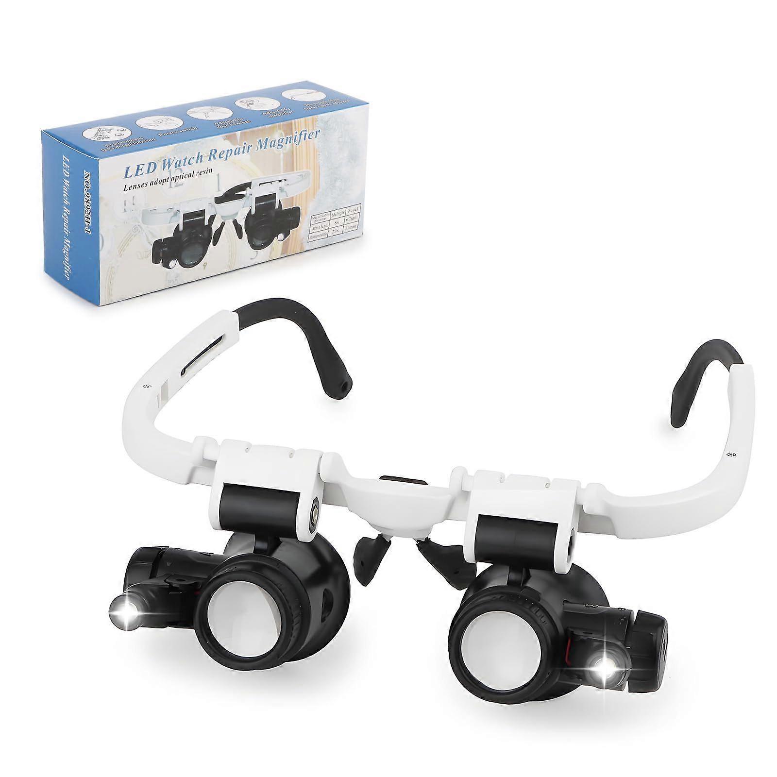 Features: High brightness LED lights with adjustable dimmable switch, flexible to adjust the desired-illumination brightness for better viewing effect. COMFORTABLE AND EASY TO USE: Comfortable eyeglass frame with rubber nose-pads.The nose pad is flexible so you can form it to fit just-right and spread pressure evenly. Alternate between wearing it as glasses or headband. The included had strap can be attached with eases to ensure a more secure fit. Separate lenses design for convenient use, if only need one lens, the other lens can be folded upwards. Multifunctional Suitable for examining and reading fine prints in newspapers, documents, maps, coin, stamps, electronic parts, jewellery, photos, or repair work for clock, watch, cellphone & etc. Present idea: Ideal present for seniors, hobbyists and professionals, thoughtfully provide helpful visual impairment aid. Notice: 1.Actual color may be slightly different from the image due to different light effect 2.Please allow 1-3cm deviation due to manual measurement Description: Product Battery: 6 LR1130 button batteries (included) Product Material: ABS, optical acrylic lenses, metal fittings Size: As picture show Package List: 1/2/3pcs Head-Mounted Magnifier with 2 LED Lights