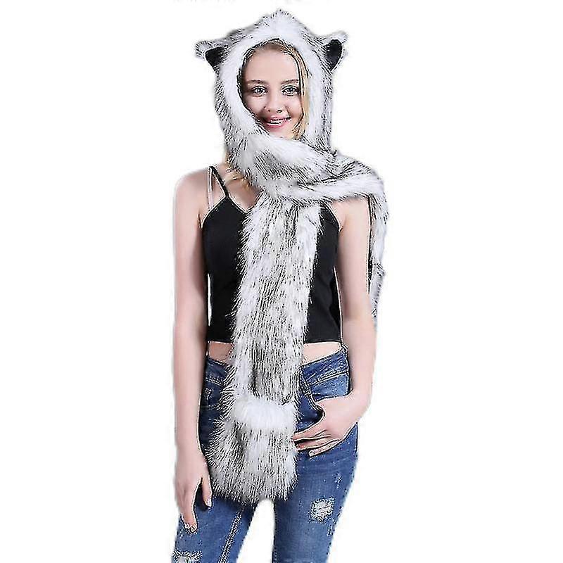 Faux Fur Animal Hat Scarf Gloves Mittens 3-in-3 Function Furry Hoodie With Paws Ears