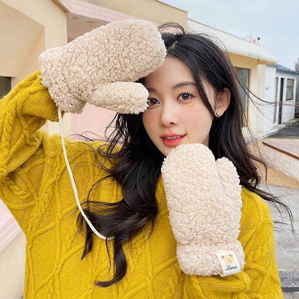 Girl Warm Winter Solid Color Soft Plush Bear Hair Mittens Winter Gloves Double Layer All Fingers