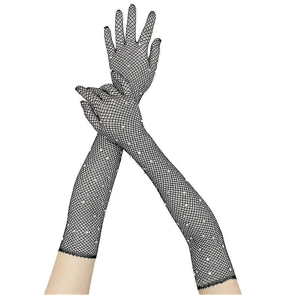 Mesh Fishnet Gloves for Women with Rhinestones Long Elegant Dance Gloves