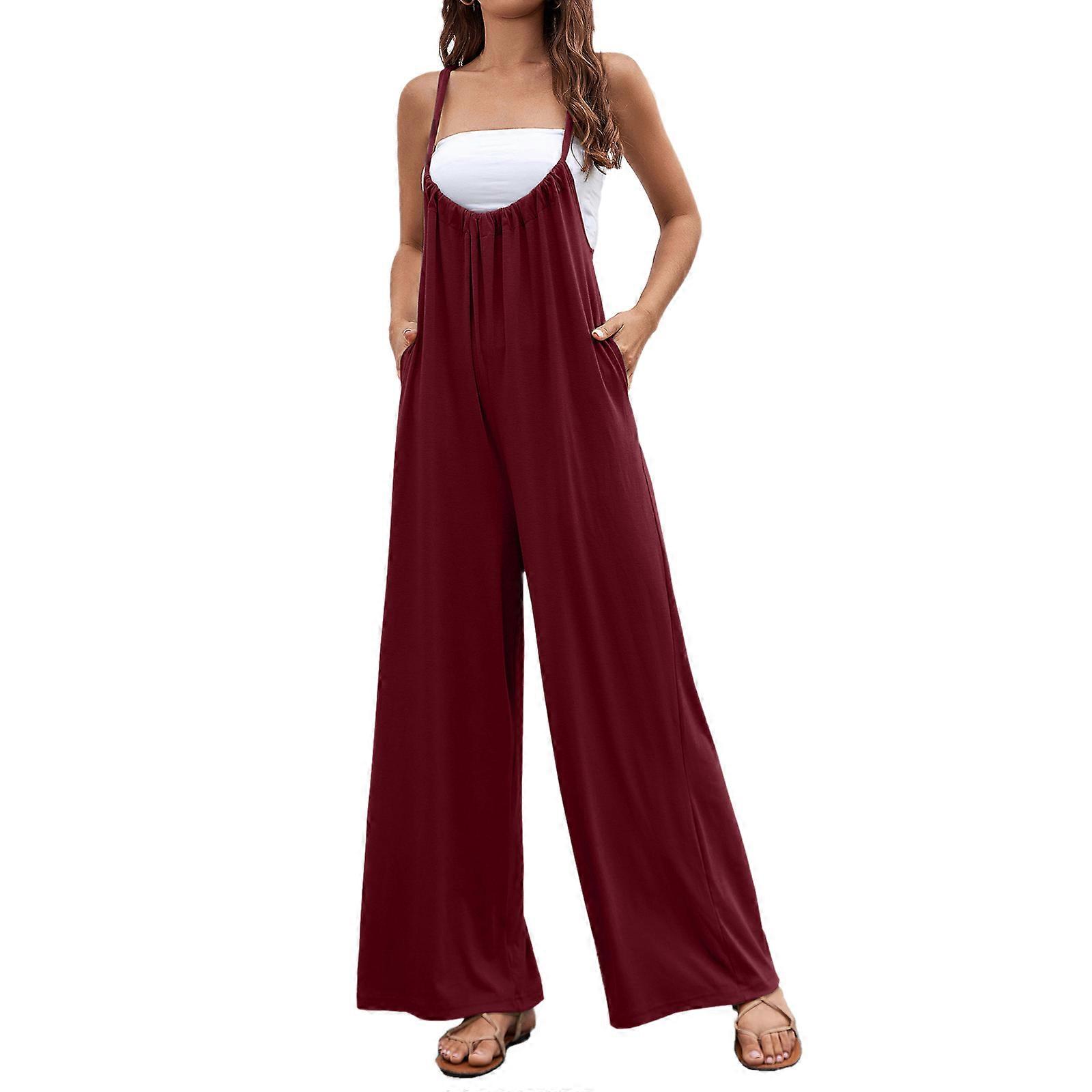 Womens Wide Leg Sleeveless Suspenders Jumpsuits Adjustable Spaghetti Strap Long Bib Pant Overalls Romper with Pockets Burgundy XL