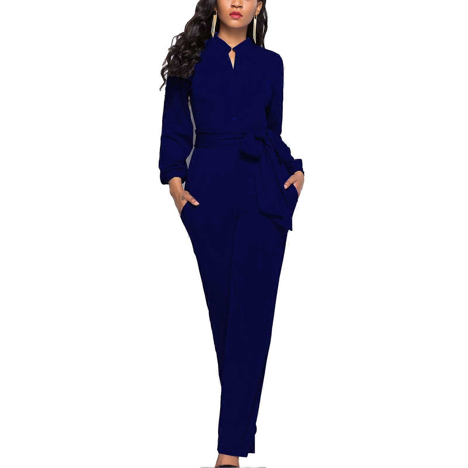 Wide Leg Sleeved Jumpsuit Casual High Waisted Tied Single Breasted Crewneck with Pockets Formal Jumpsuit for Women Dark Blue M