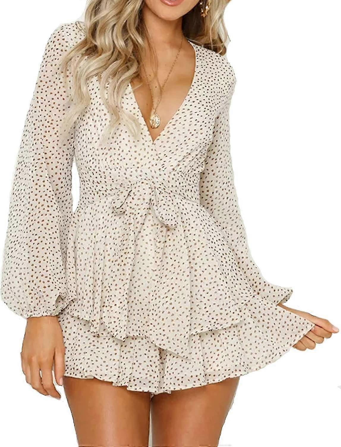 Women's Polka Dot Jumpsuits Deep V-neck Long Sleeve Knot Front Ruffle Hem Floral Rompers