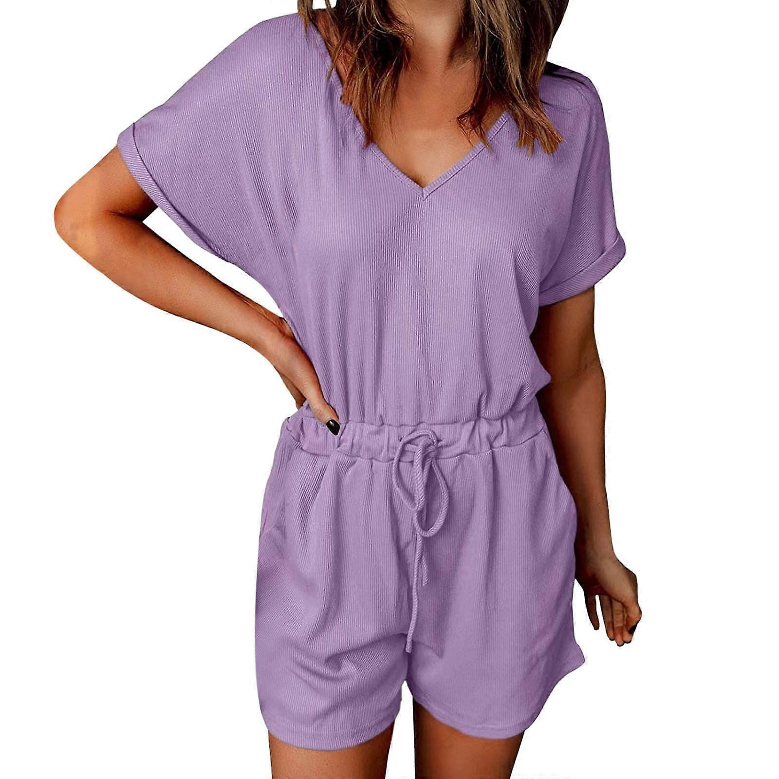 Womens Jumpsuits And Rompers Dressy V Neck Loose Short Sleeve Elastic Waist Outfits With Pockets Rompers For Women Summer Plus Size
