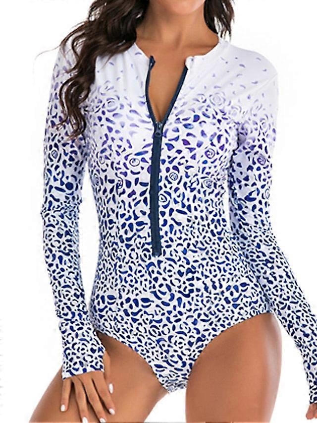 Women's Uv Protection Rash Guard Swimsuit, Zipper, Color Block, Blue, Padded, High Neck, Fashionable