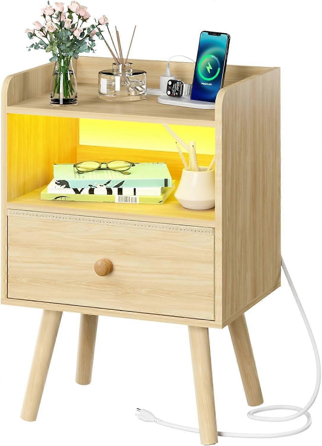 Nightstand with Charging Station, LED Lights, Fabric Drawer & Storage Shelf, USB Ports Compatible with Bedroom, Office, Home