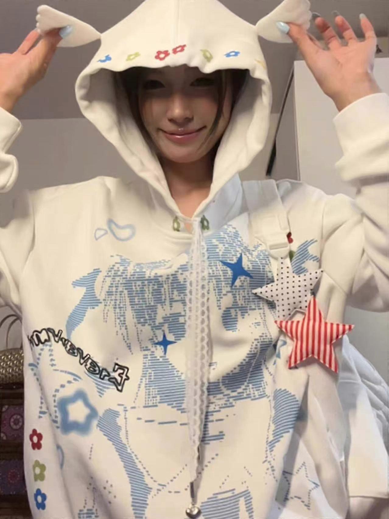 Hand-Drawn Graffiti Angel Wings Ears Hoodie Women