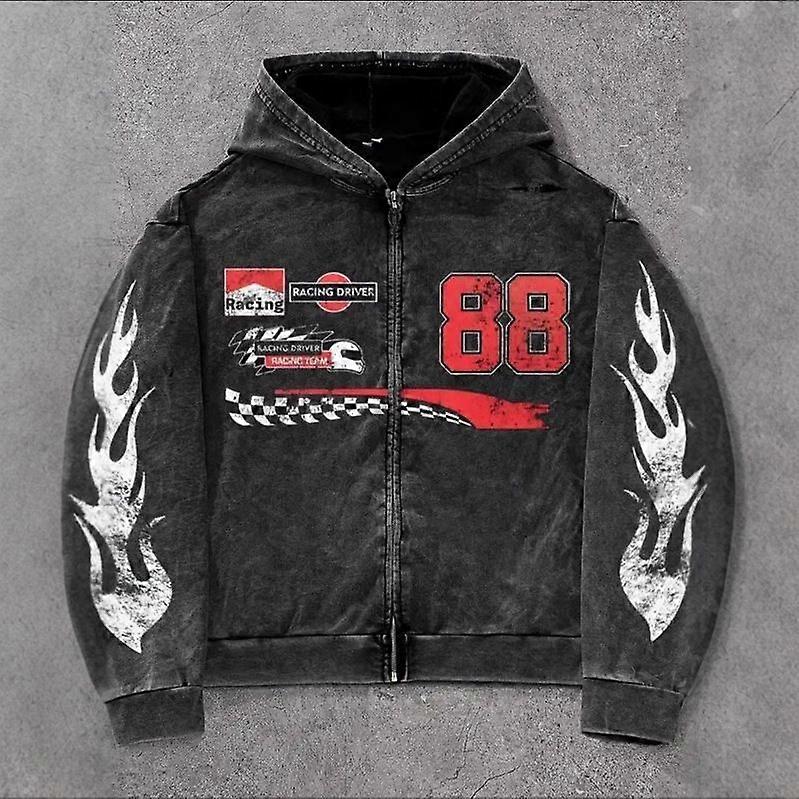 Vintage Zip Up Hoodie Streetwear Dark Style Printed Distressed Loose Fit Jacket