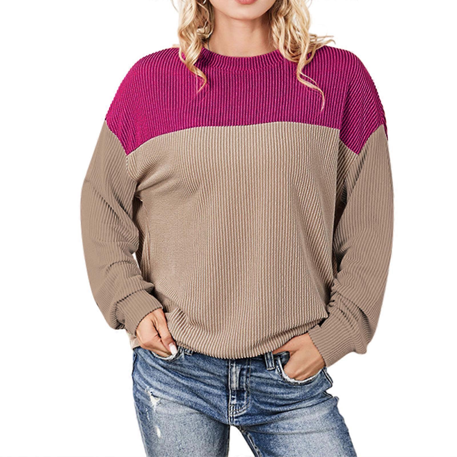 Womens Fashion Casual Color Block Long Sleeve Sweatshirt Crewneck Ribbed Knit Oversized Loose Pullover Tops Streetwear 7 XL