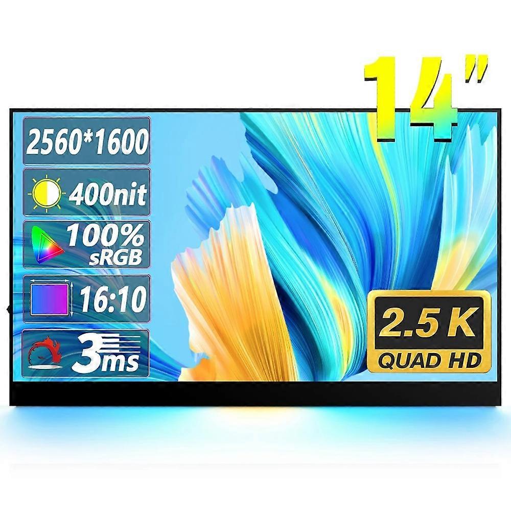 14 inch HDR 2560x1600P IPS Screen Portable Monitor 1. Portable 2.5K Monitor: Featuring an IPS 178 degrees screen and HDR support, this monitor offers low blue light for comfortable viewing over extended periods. No driver installations or complex procedures are required. Simply connect via USB Type-C or HDMI (both cables included). Its strong connection stability prevents disruptions during your work. 2. Lag-free Portable Screen: This 14-inch USB-C monitor boasts a 10ms response time, 2560x1600 high resolution, and 350cdm2 brightness for clearer images and smoother video playback while working or watching movies. 3. Multiple Device Connections: Equipped with 2 x USB Type-C ports, 2 x mini HDMI ports, this external display works in both landscape and portrait modes, serving as an extension screen for Macbooks or phones. It is compatible with most laptops, smartphones, PCs, keyboards, PS4PS5, XBOX, Nintendo Switch, and more. 4. Dual Speakers: Built-in dual speakers deliver booming sound with crystal-clear audio quality, creating an immersive home theater experience for your comfort. Additionally, the 3.5mm audio input allows you to add your own speakers for enhanced sound. 5. Memory Function Monitor: Switching to default power-saving mode, adjust the Low Power Mode under Size & Power from active to off. When you power on the portable screen, it will automatically retain your previous settings. Compatible with laptops, PCs, Raspberry PiPS3PS4Xbox, Nintendo Switch, and most HDMI devices. Parameter Panel type: 14-inch IPS screen Resolution: 2560x1600P QHD Display color: 16.7M Viewing angle: 178 degrees full viewing angle Contrast ratio: 1200:1 Brightness: 350cdm2 Refresh rate: 60Hz Built-in speakers: Dual 8ohm 2W speakers Input interface: Full-featured Type-C x2, Mini HDMI x2 Packing list 1 x Monitor 1 x HDMI Cable 1 x Type-C to Type-C Cable 1 x Type-C to USB-A Cable 1 x Wall Charger 1 x Protective Case