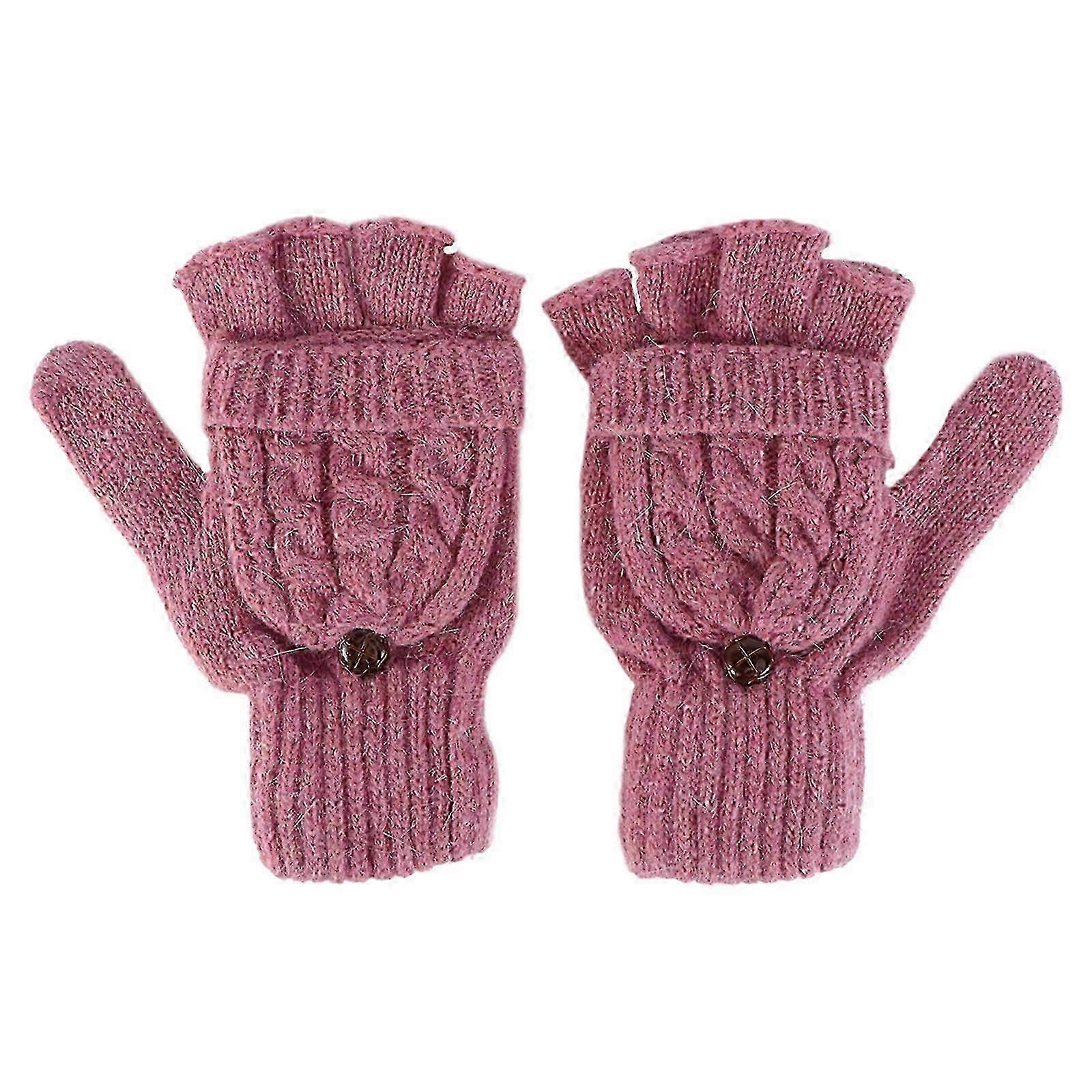 Women Winter Warm Wool Knitted Convertible Fingerless Gloves With Mitten Cover (Pink)