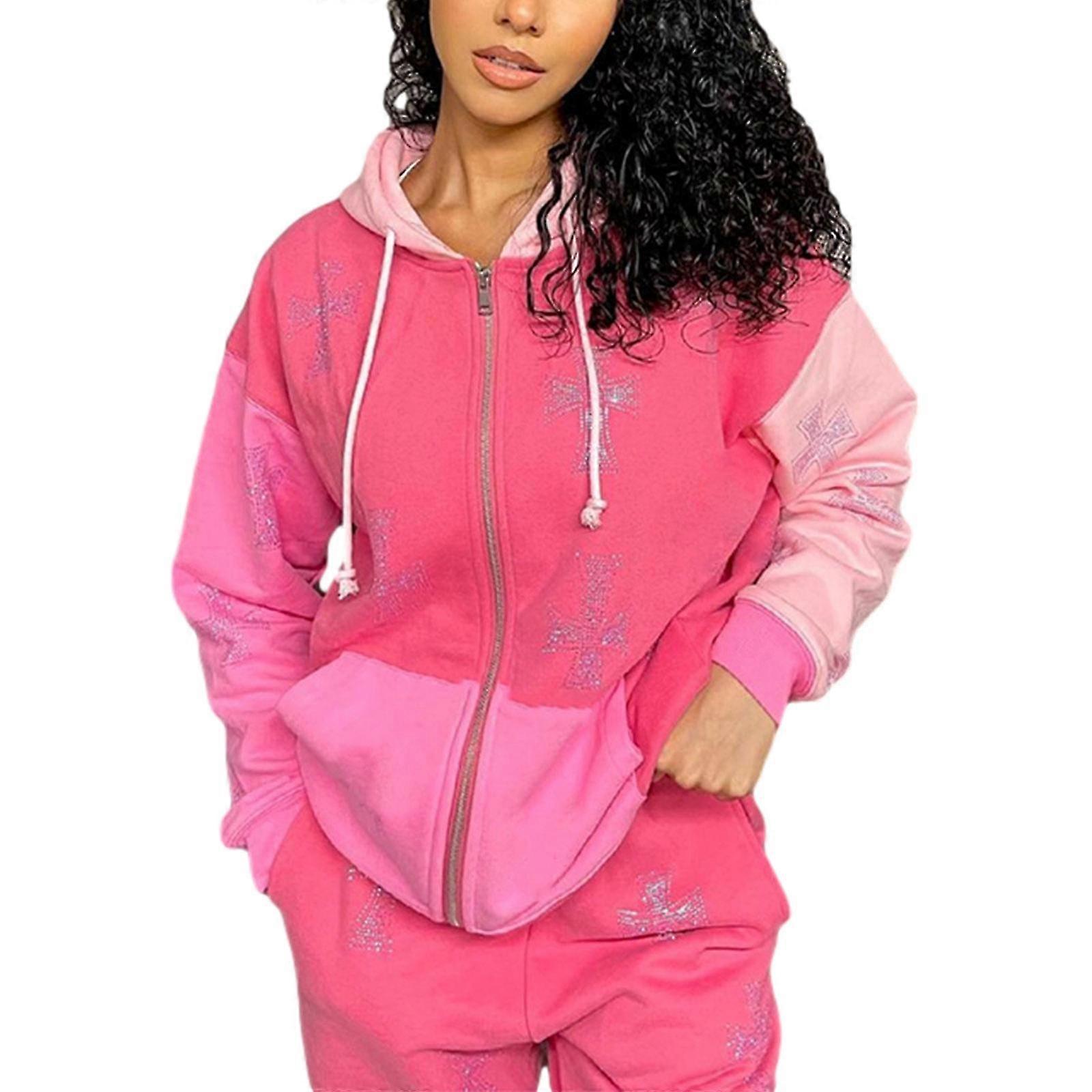 Women Rhinestones Hooded Jacket With Smooth Zipper Spring Fall Oversized Hoodie Coat Vintage Graphic Goth Streetwear