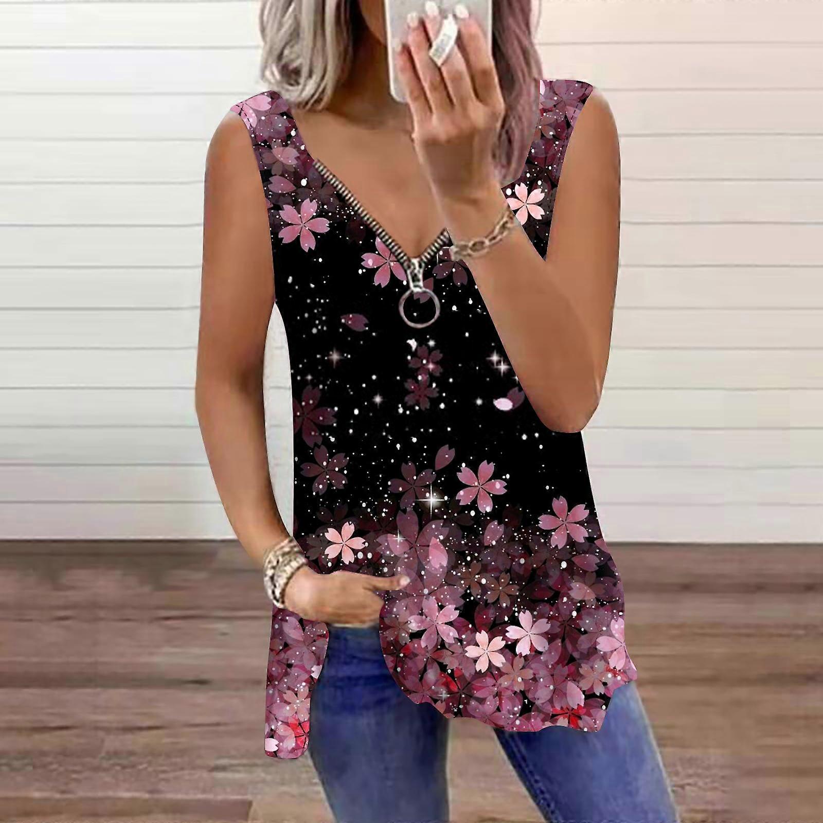 Women's Top Summer Falling Flowers Printed Casual Plus Size Sleeveless Zipper V-neck Top Tank Top