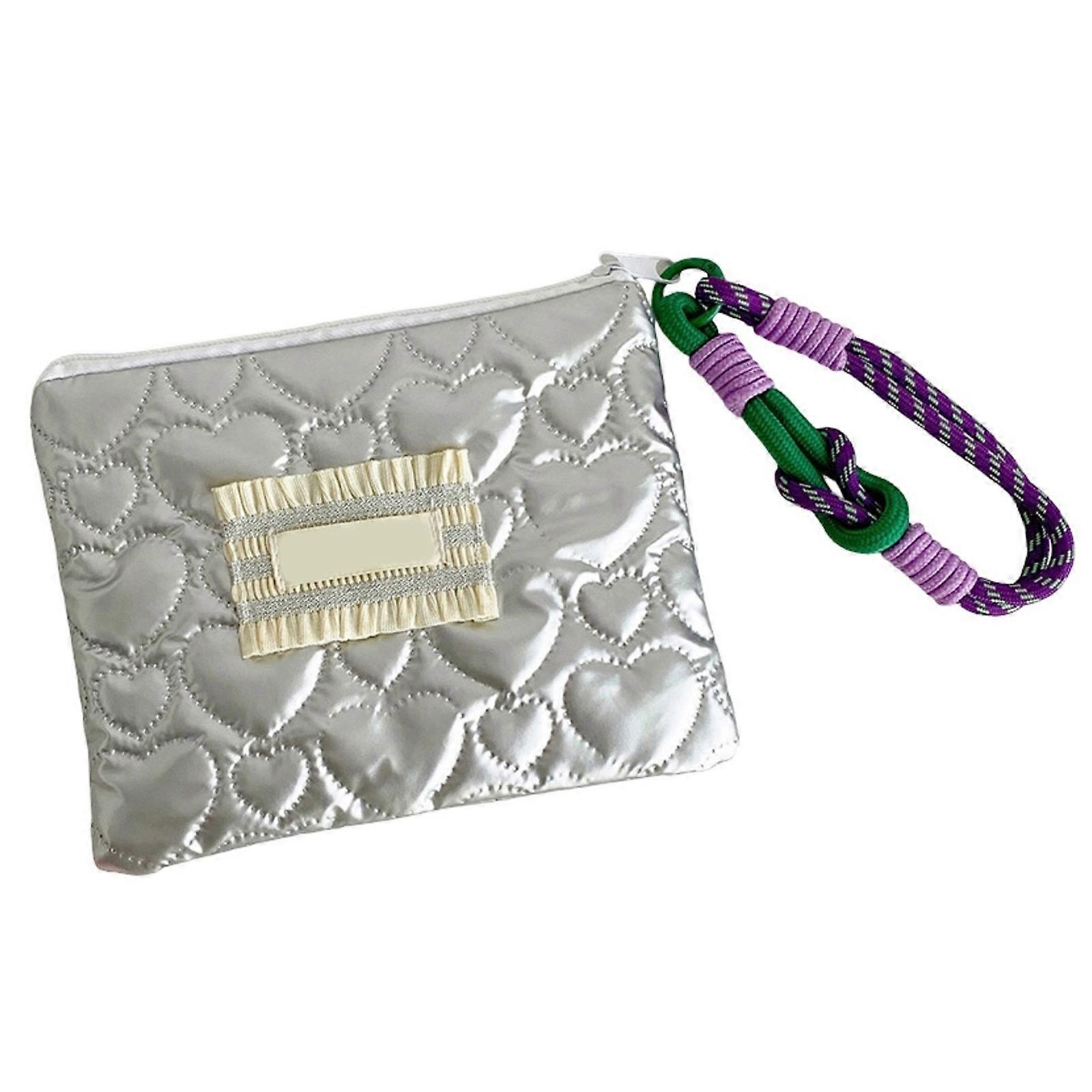 Small Silver Travel Cosmetic Bag With Lanyard Closure Embossed Pattern Fabric Skincare Organizer For Daily Commutes Use Purple