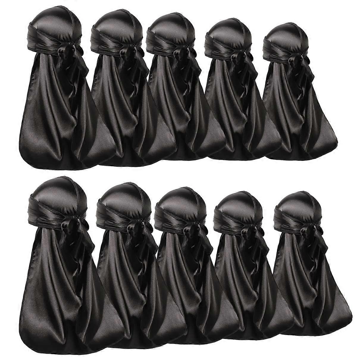 10 Pack Silky Durags for 360 Waves Men and Women, Black Satin Wave Cap with 43Inch Long Tail