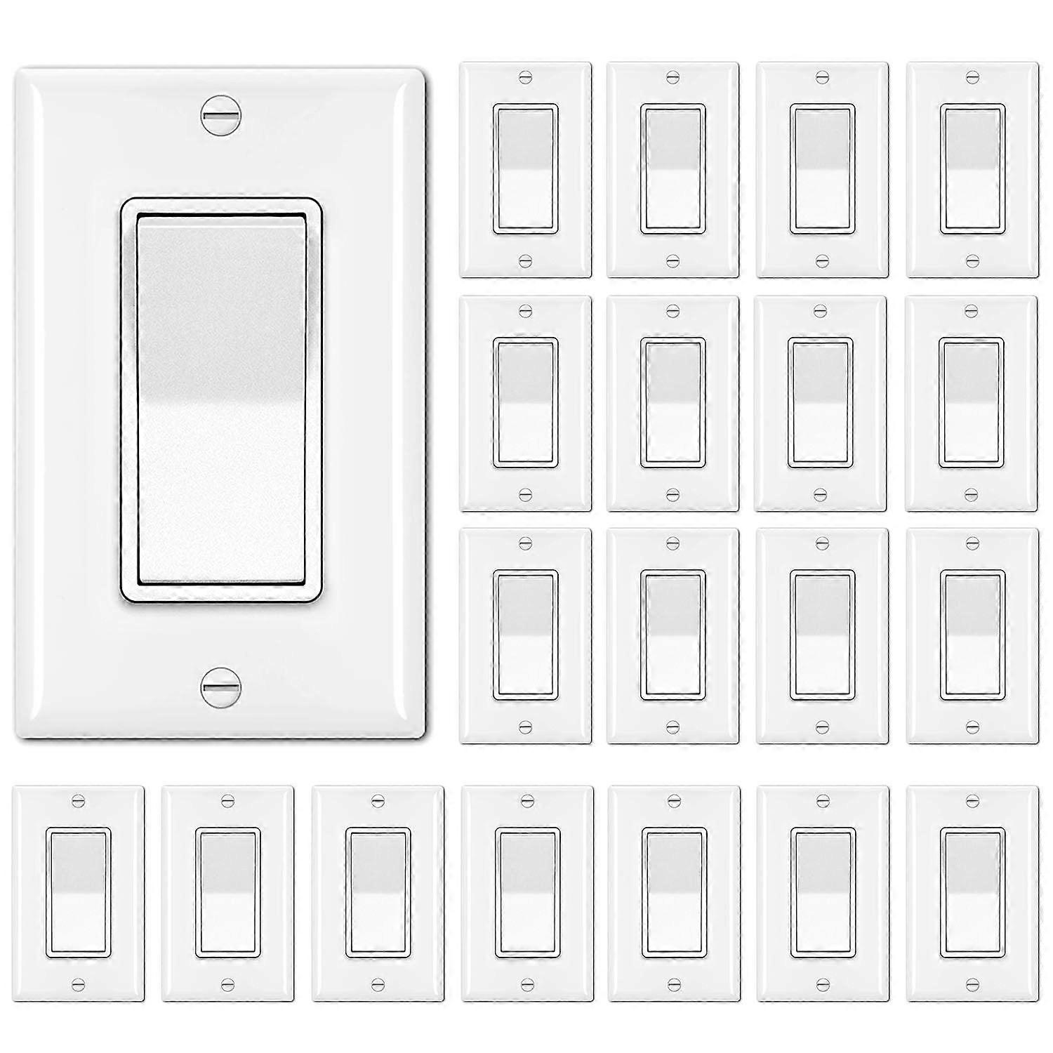 20 Pack Single Pole Decorator Wall Light Switch with Wallplate 15A 120/277V On/Off Rocker Paddle Interrupter UL Listed White Single Pole