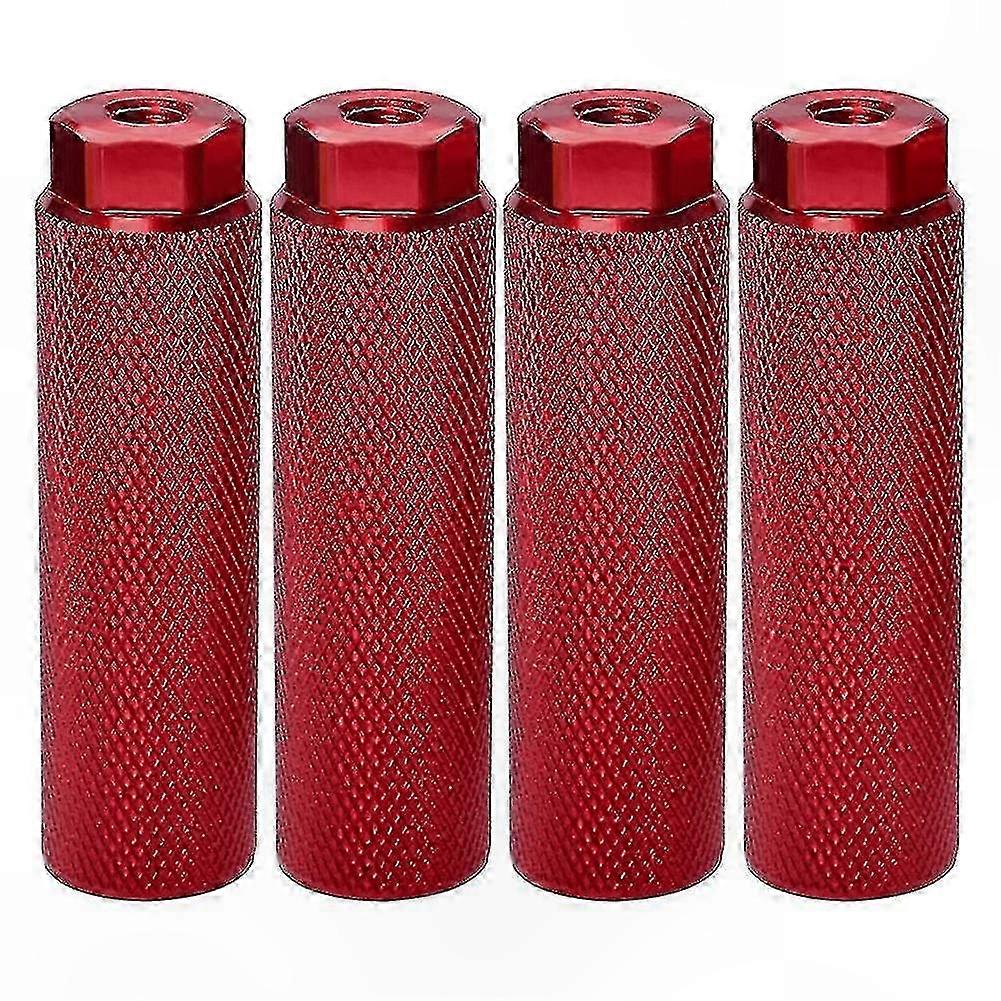 [High Quality]: Made from high-strength aluminum alloy with a robust structure and high load capacity. Fits 3/8 inch shaft. Compatible with general-purpose bicycles, road bikes, mountain bikes, track bikes, and other bicycle types. [Multifunctional]: Compact bike pegs with knurled surface for non-slip performance. Suitable for front and rear axles, serving as convenient tools for carrying or support. [Easy to Use]: Install on the rear axle of the bicycle. Ensure the axle bolt protrudes at least 6 mm after installation, or remove the axle nut completely. A longer protruding bolt provides more secure installation. [Special Design]: Durable and stylish design featuring cylindrical non-slip grooves for enhanced safety and longevity. Material: Aluminum alloy Color: Red Package Contents: 4 x Bike Pegs Note: Light shooting and different displays may cause slight color variations between the image and actual item. Measurement allows an error of +/- 1-3 cm.