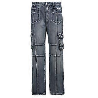 Mulheres Alta Cintura Carga Jeans Vintage Lavado Listrado Multi Bolsos Calças jeans
